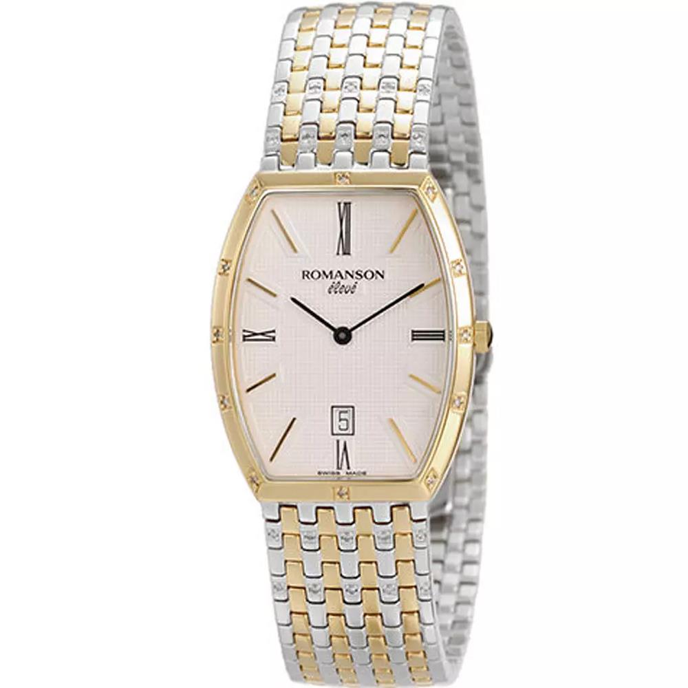 ساعت مچی مردانه رومانسون ROMANSON با طراحی روزانه بند استیل طلایی نگین دار با قاب نگین دار دو رنگ و صفحه متفاوت سفید و موتور سوییسی با انرژی باطری وقابلیت داشتن تقویم و مقاوم در برابر آب تا عمق 30 متر به همراه دو سال گارانتی بین المللی