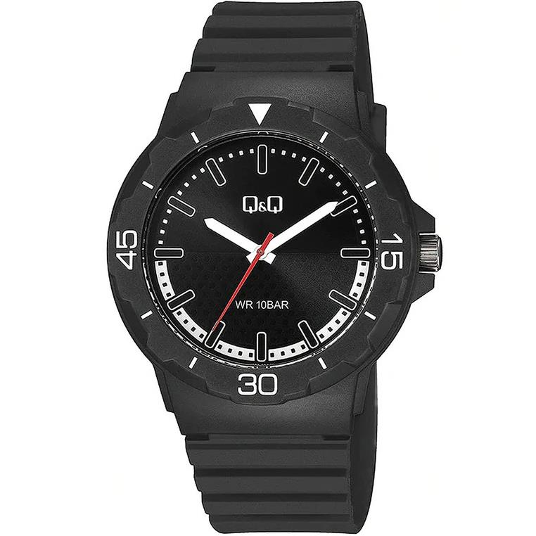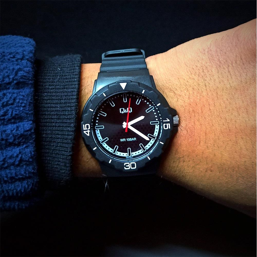 ساعت مچی مردانه کیو اند کیو QQ با طراحی روزانه بند سیلیکونی مشکی و قاب گرد مشکی و صفحه گرد مشکی با قابلیت داشتن شب نما و موتور ژاپنی با انرژی باطری و مقاوم در برابر آب تا عمق 100 متر به همراه یک سال گارانتی شرکتی