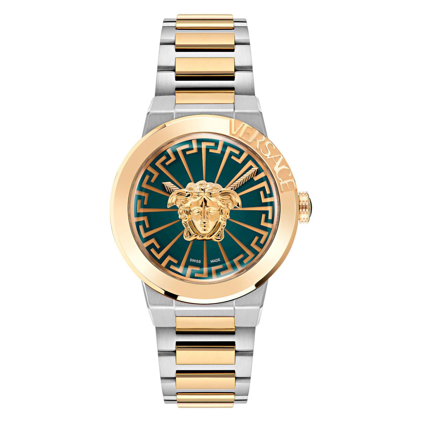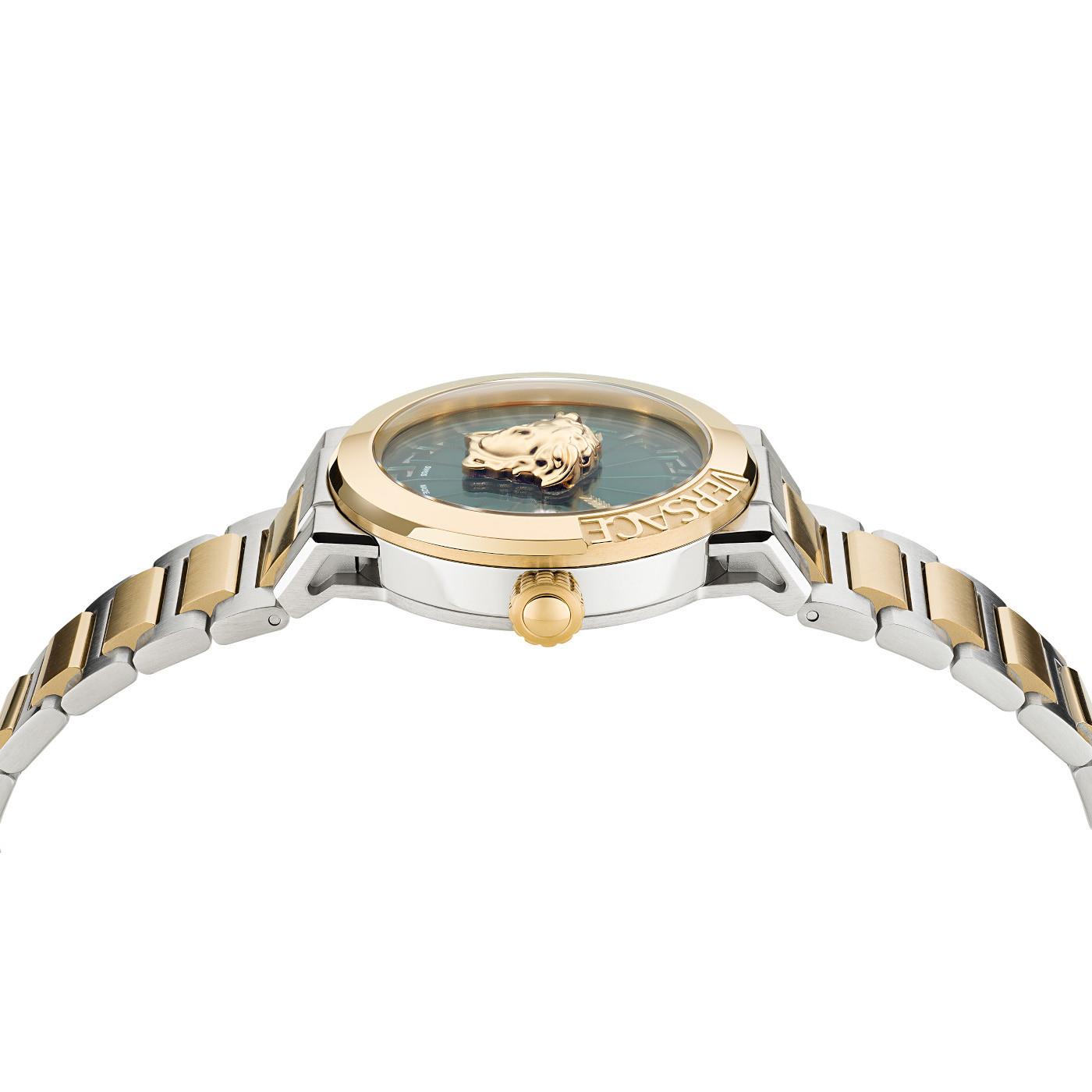 ساعت مچی زنانه Versace ورساچه با طراحی روزانه بند استیل طلایی , قاب استیل طلایی و صفحه گرد سبز با شیشه ضد خراش و موتور سوئیسی با انرژی باتری و مقاومت در برابر آب تا عمق 50 متر به همراه دو سال گارانتی بین المللی