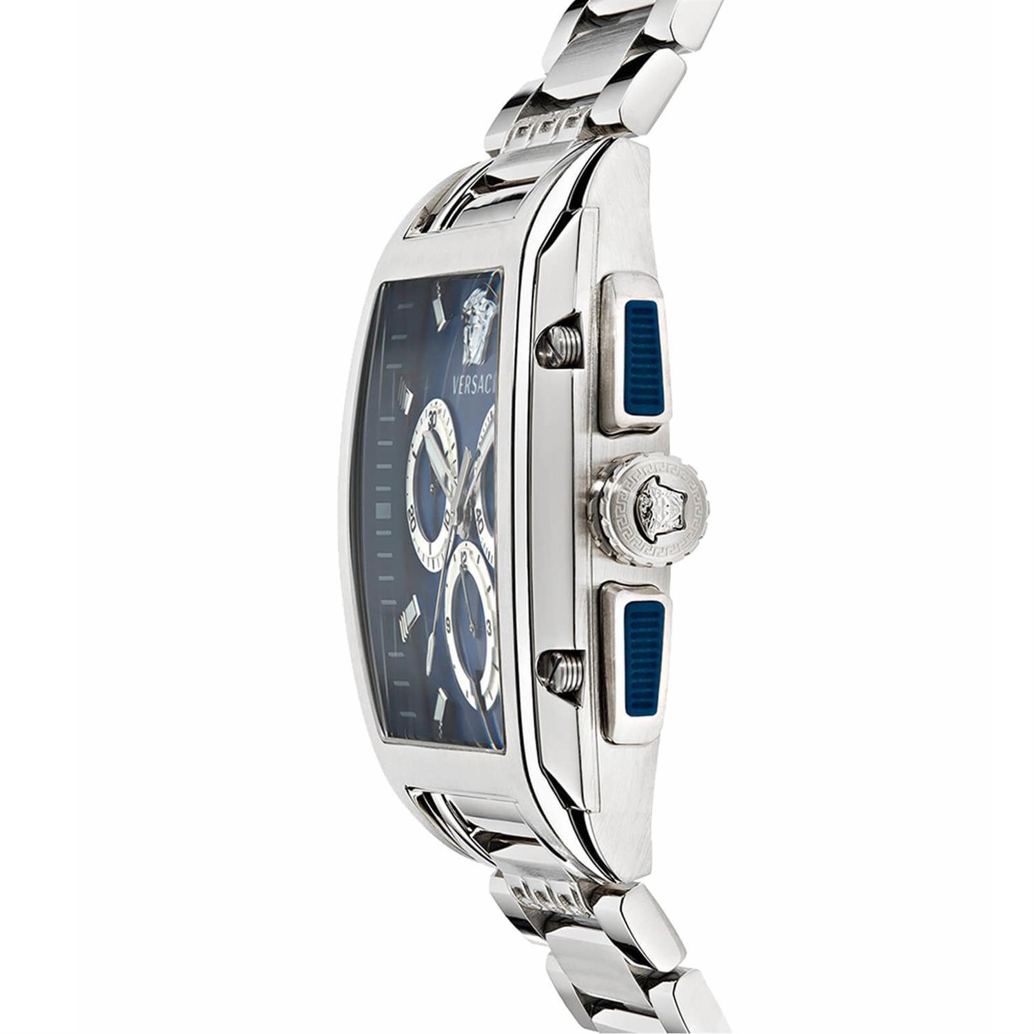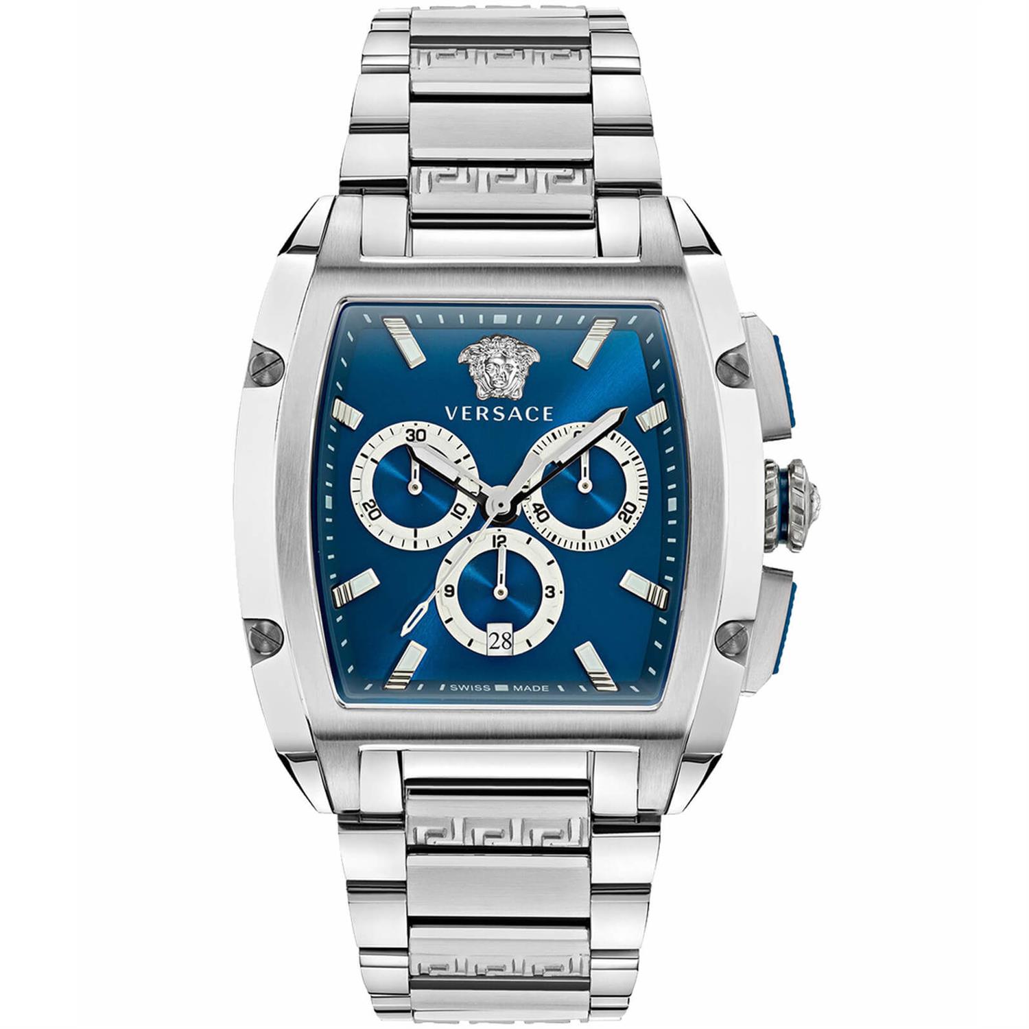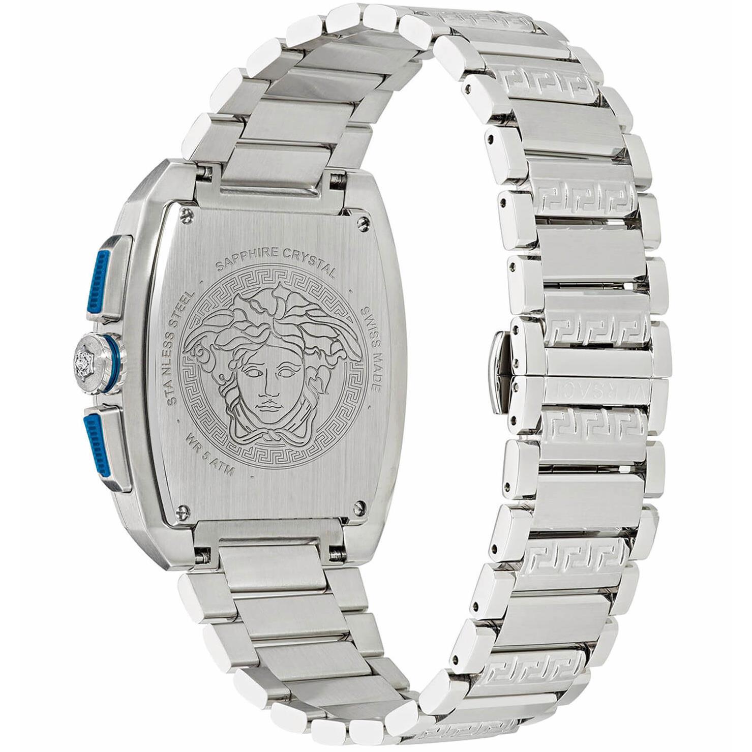 ساعت مچی مردانه Versace ورساچه با طراحی روزانه بند استیل, قاب مستطیل استیل و صفحه مستطیل سرمه ای با شیشه ضد خراش و موتور سوئیسی با انرژی باتری و قابلیت داشتن کرنوگراف ,تقویم , شب نما و مقاومت در برابر آب تا عمق 50 متر به همراه دو سال گارانتی بین المللی