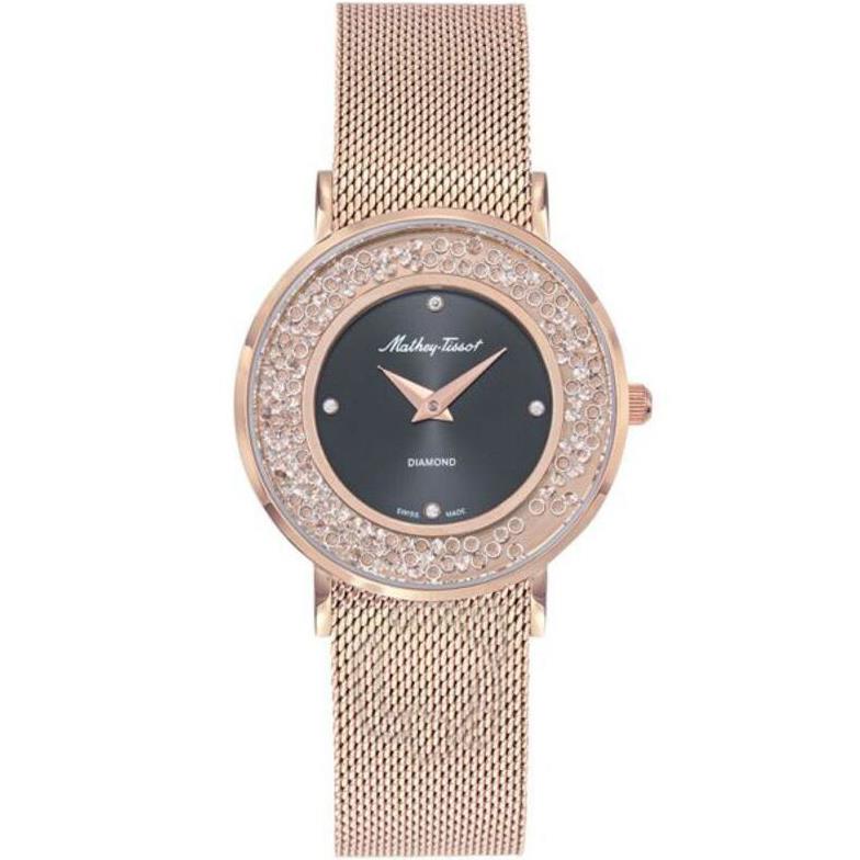 ساعت مچی زنانه متی تیسوت matheytissot با طراحی روزانه بند حصیر بافت مسی و قاب گرد مسی با صفحه نگین دار مشکی و موتور سوییسی و انرژی باتری با مقاومت در برابر آب تا عمق 50 متر به همراه دو سال گارانتی بین المللی