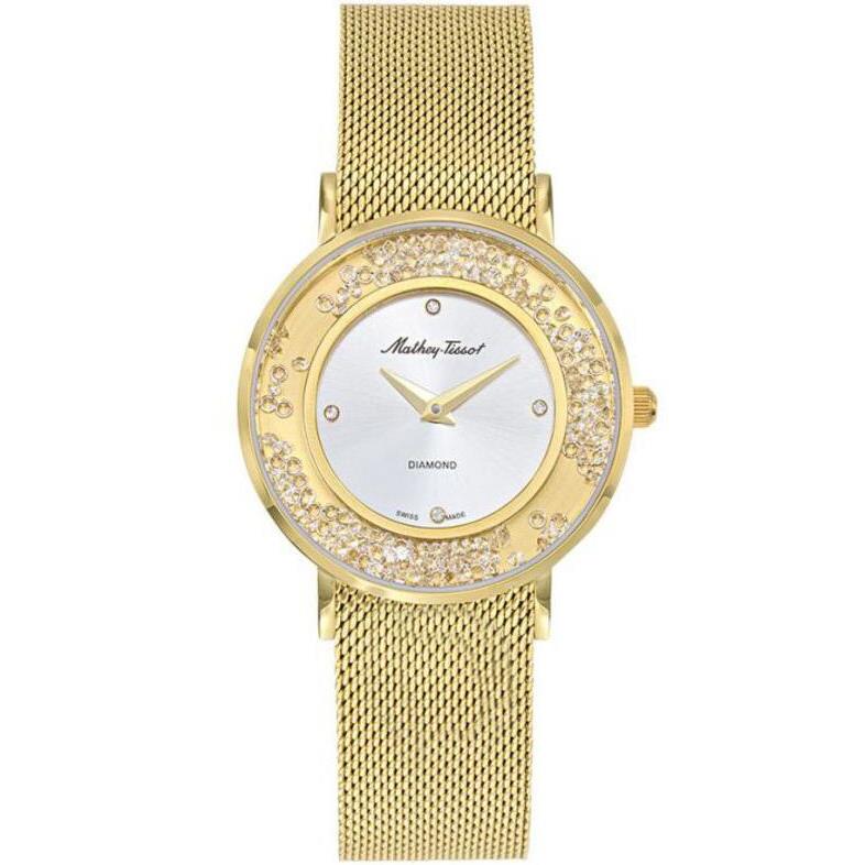 ساعت مچی زنانه متی تیسوت matheytissot با طراحی روزانه بند حصیر بافت طلایی و قاب گرد طلایی با صفحه نگین دار نقره ای/ طلایی و موتور سوییسی با انرژی باتری و مقاومت در برابر آب تا عمق 50 متر به همراه دو سال گارانتی بین المللی
