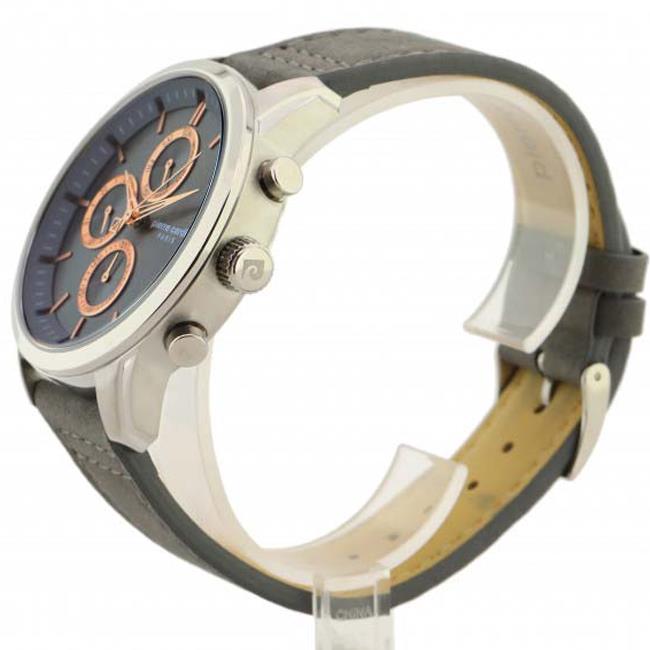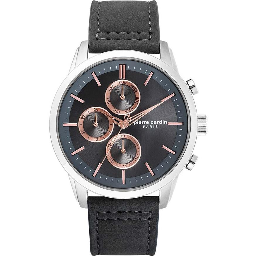 ساعت مچی مردانه پیرکاردین pierrecardin با طراحی روزانه بند چرمی طوسی و قاب استیل و صفحه گرد طوسی با قابلیت داشتن تقویم , روز و شب , روزهای هفته و موتور ژاپنی و انرژی باتری و مقاومت در برابر آب تا عمق 50 متر به همراه دو سال گارانتی بین المللی