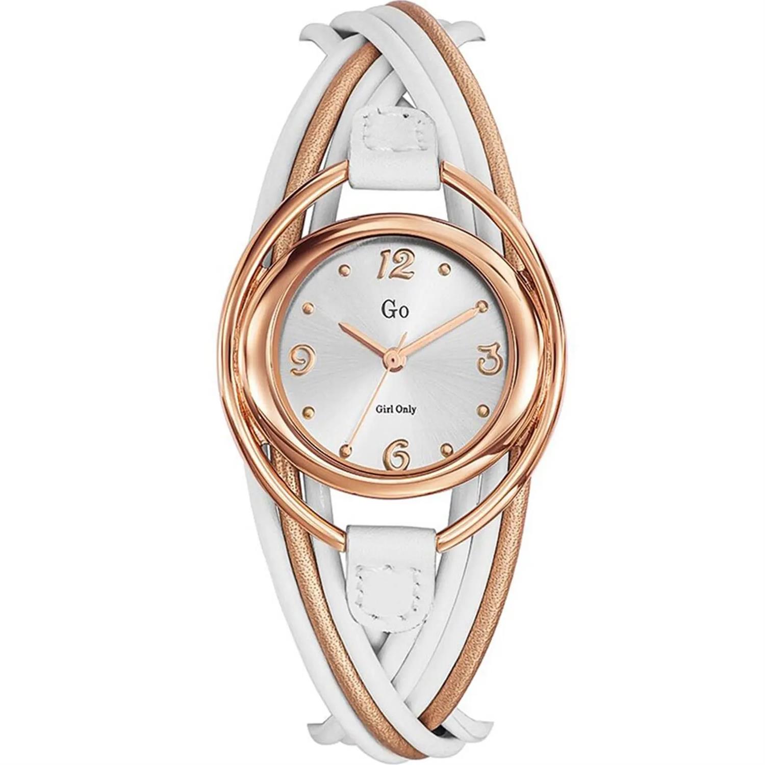 ساعت مچی زنانه جی اوgo با طراحی روزانه بند چرمی دو رنگ و قاب فلزی مسی و صفحه گرد نقره ای با موتور ژاپنی و انرژی باتری و مقاومت در برابر آب تا عمق 30 متر به همراه دو سال گارانتی بین المللی
