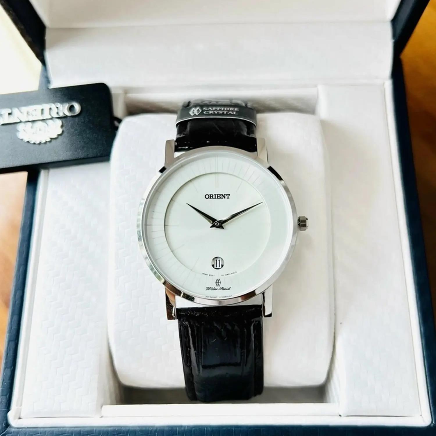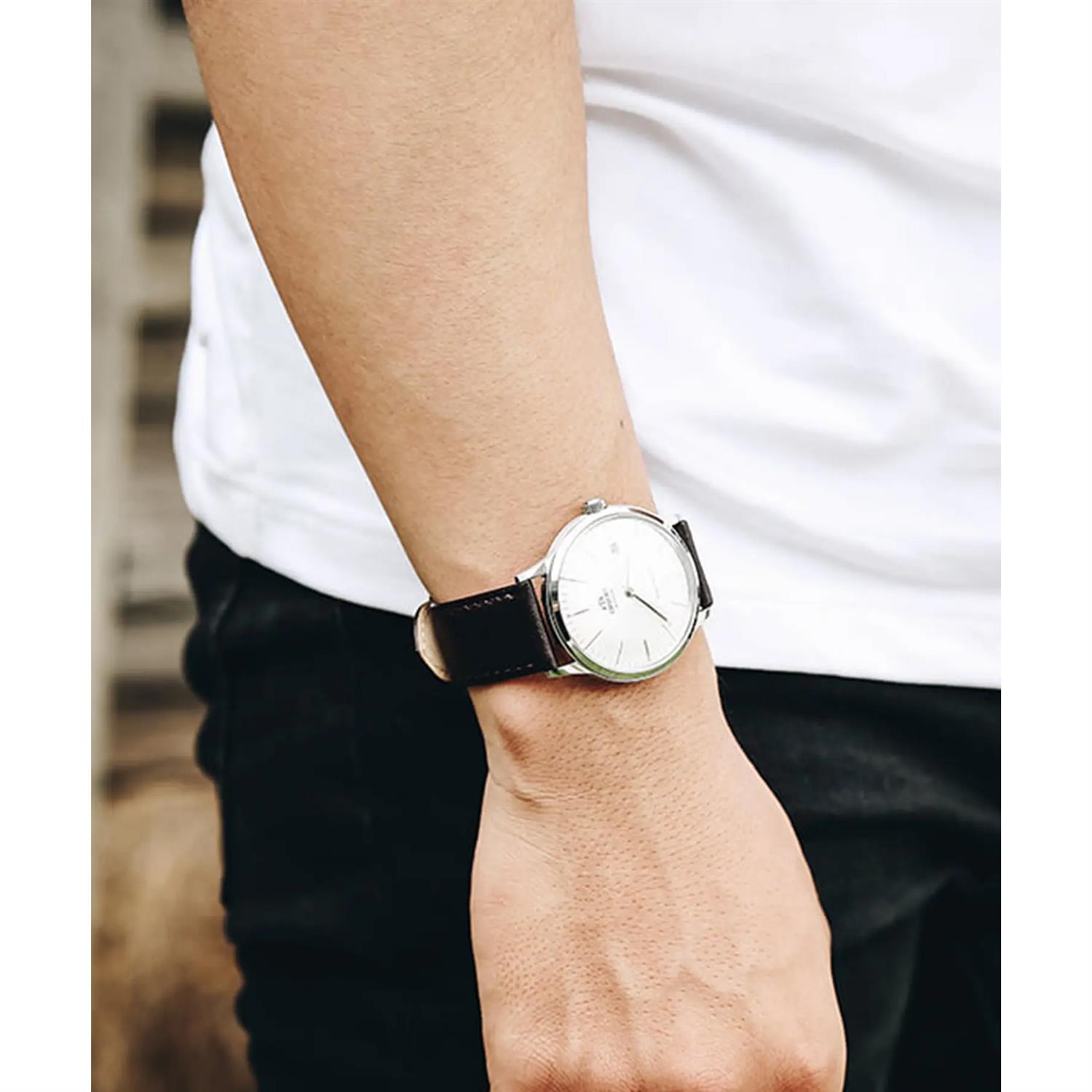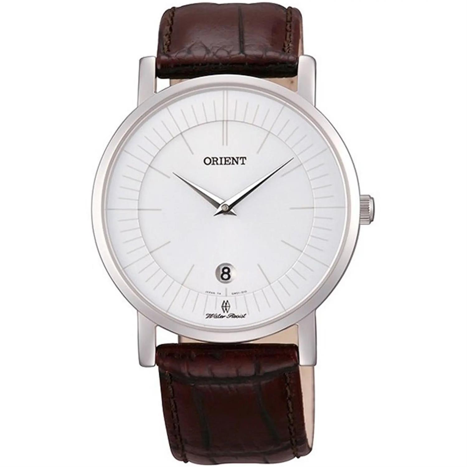 ساعت مچی مردانه اورینت orient با طراحی روزانه بند چرمی قهوه ای و قاب استیل و صفحه گرد سفید و قابلیت داشتن تقویم و موتور ژاپنی با انرژی باتری و مقاومت در برابر آب تا عمق 50 متر به همراه دو سال گارانتی بین المللی