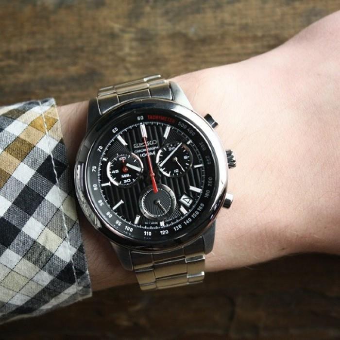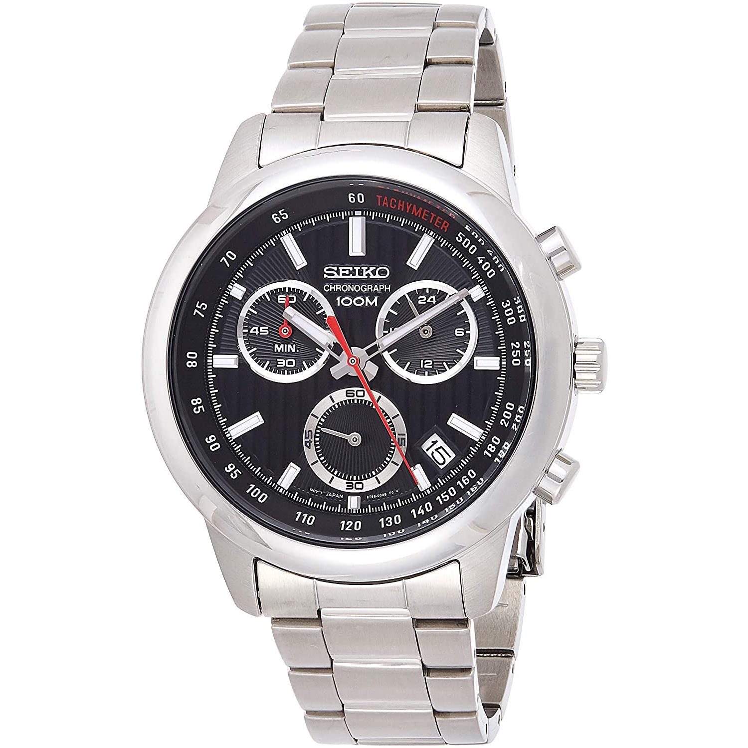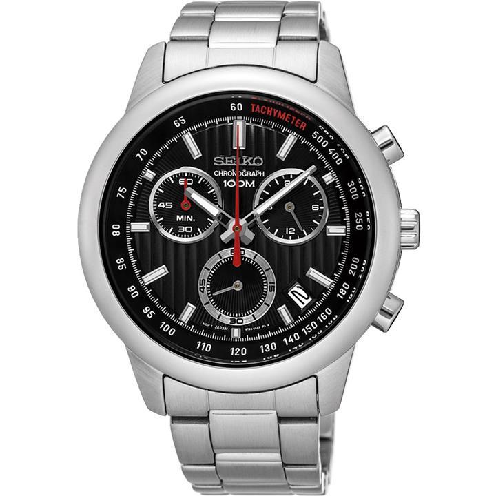 ساعت مچی مردانه سیکو seiko با طرای اسپرت بند استیل و قاب گرد استیل با صفحه مشکی و موتور ژاپنی با انرژی باتری و قابلیت داشتن تقویم , شب نما ,کرنوگراف , زه تاچی مترو مقاومت در برابر آب تا عمق 100 متر به همراه دو سال گارانتی بین المللی