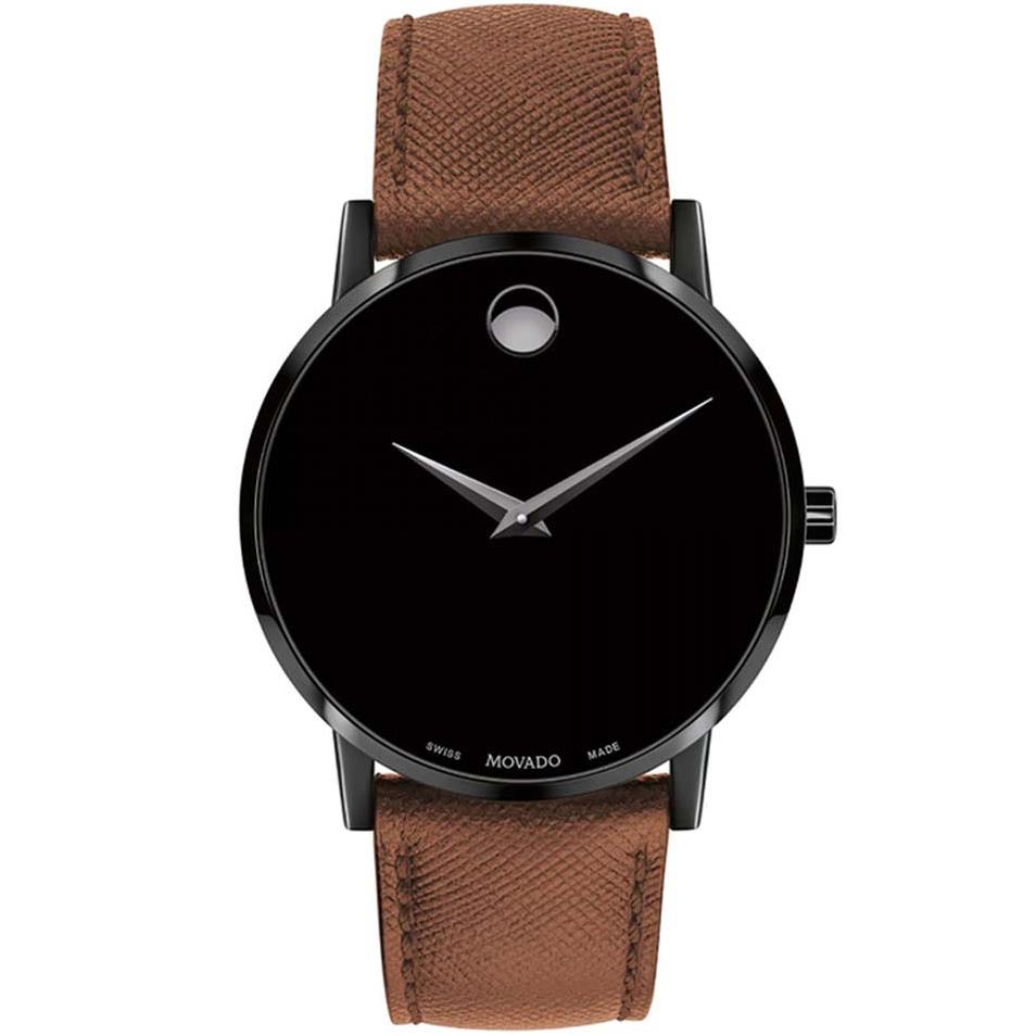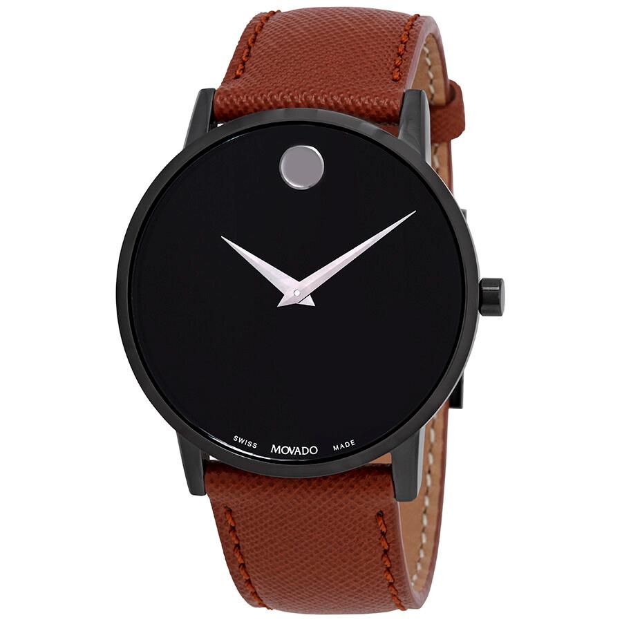 ساعت مچی مردانه موادو MOVADO با طراحی روزانه بند چرمی و قاب فلزی مشکی و صفحه گرد مشکی و موتور سوییسی با انرژی باتری و مقاوم در برابر آب تا عمق 30 متر به همراه دو سال گارانتی بین المللی