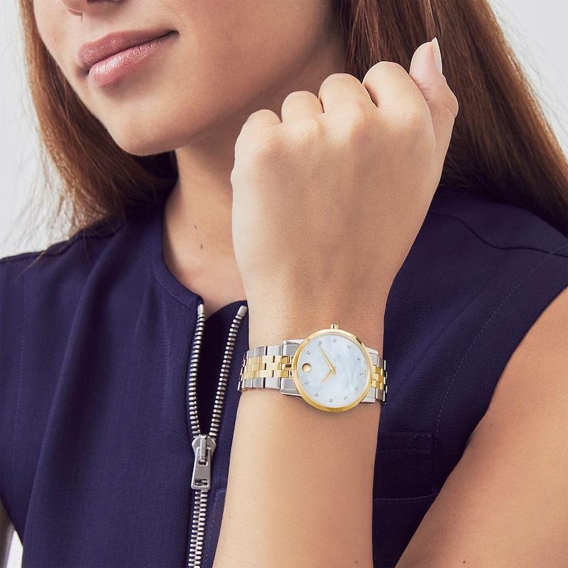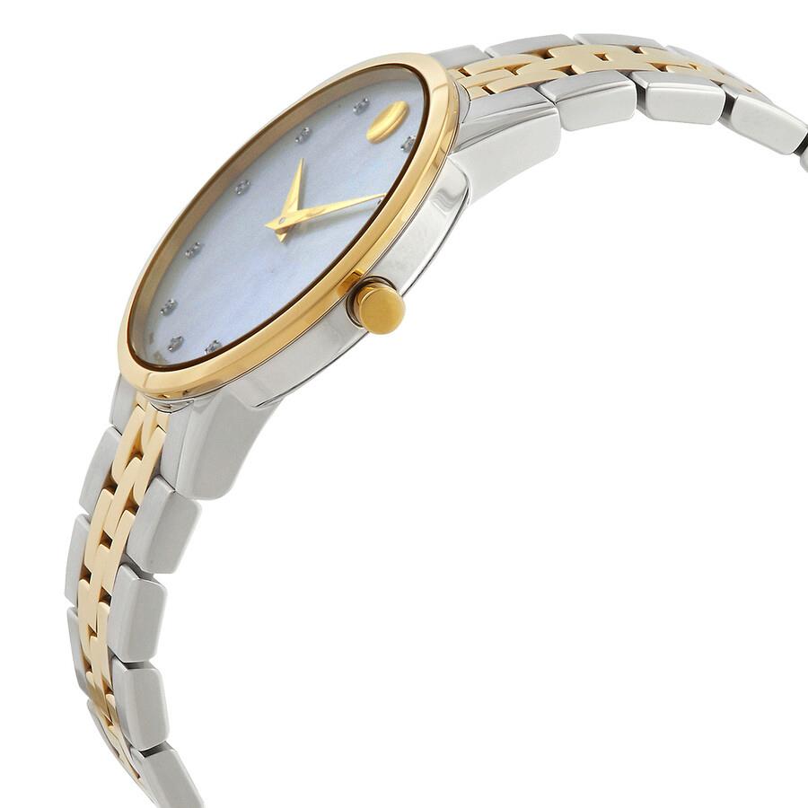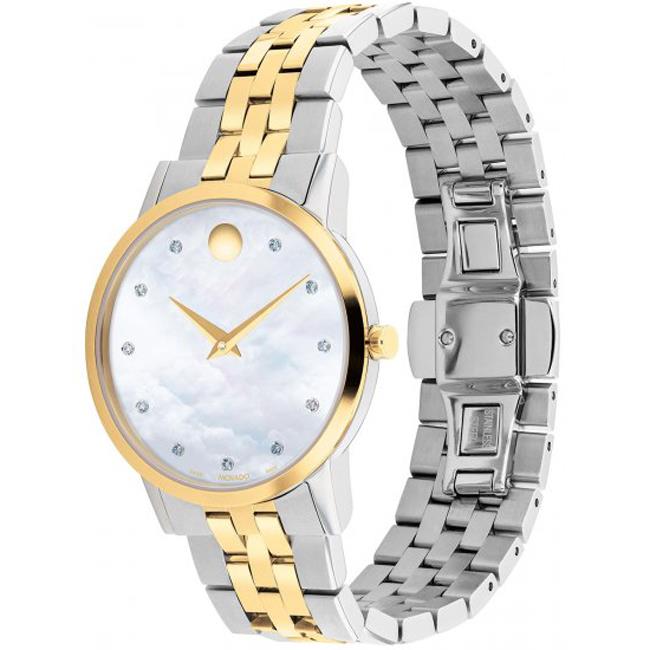 ساعت مچی زنانه movado با طراحی کلاسیک بند طلایی استیل و قاب گرد طلایی استیل و صفحه سفید صدفی مزین به نگین برلیان با شیشه ضد خراش و موتورسوئیسی با انرژی باتری و مقاومت در برابر آب تا عمق 30 متر به همراه دو سال گارانتی بین المللی