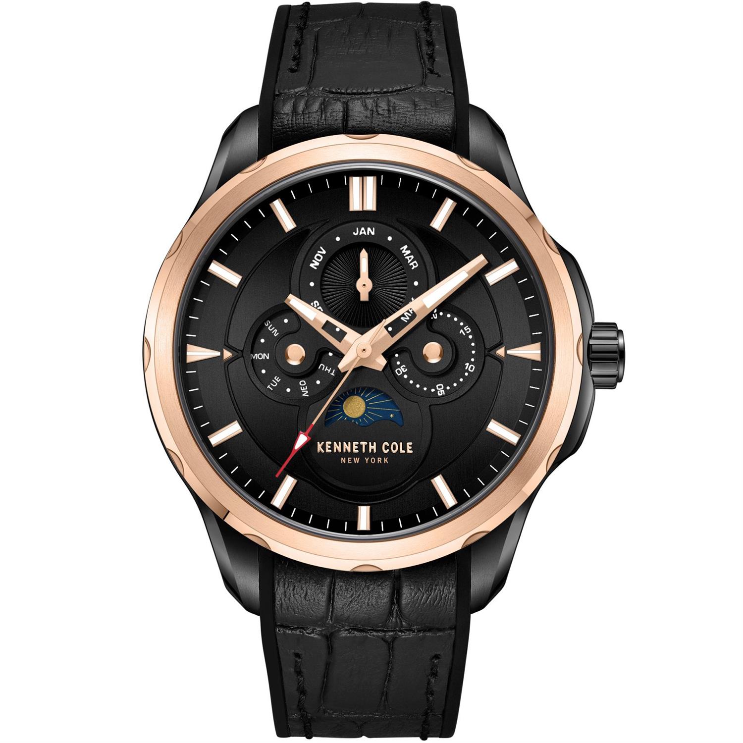 ساعت مچی مردانه کنت کول kenneth cole با طراحی روزانه بند سیلیکونی , قاب فلزی مشکی مسی و صفحه گرد مشکی با قابلیت داشتن شب نما/ نمایش ماه میلادی /روزهای هفته /موقعیت کنونی ماه و ستاره و موتورژاپنی با انرژی باتری و مقاومت در برابر آب تا عمق 50 متر به همراه دو سال گارانتی بین المللی