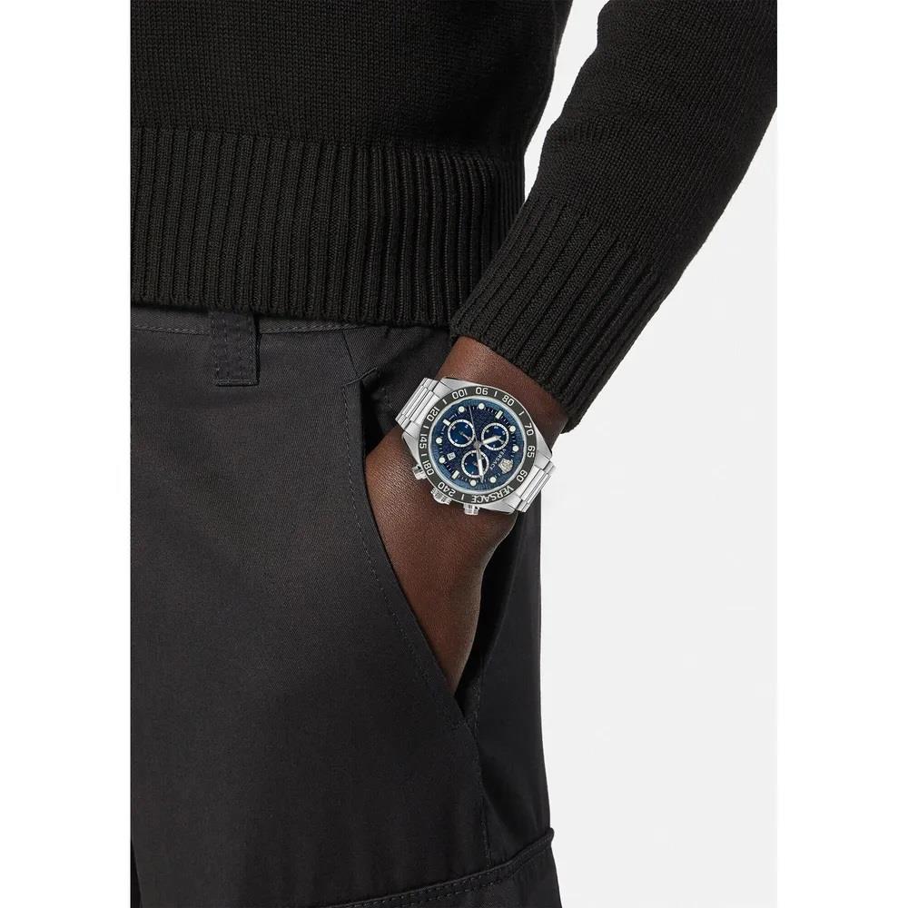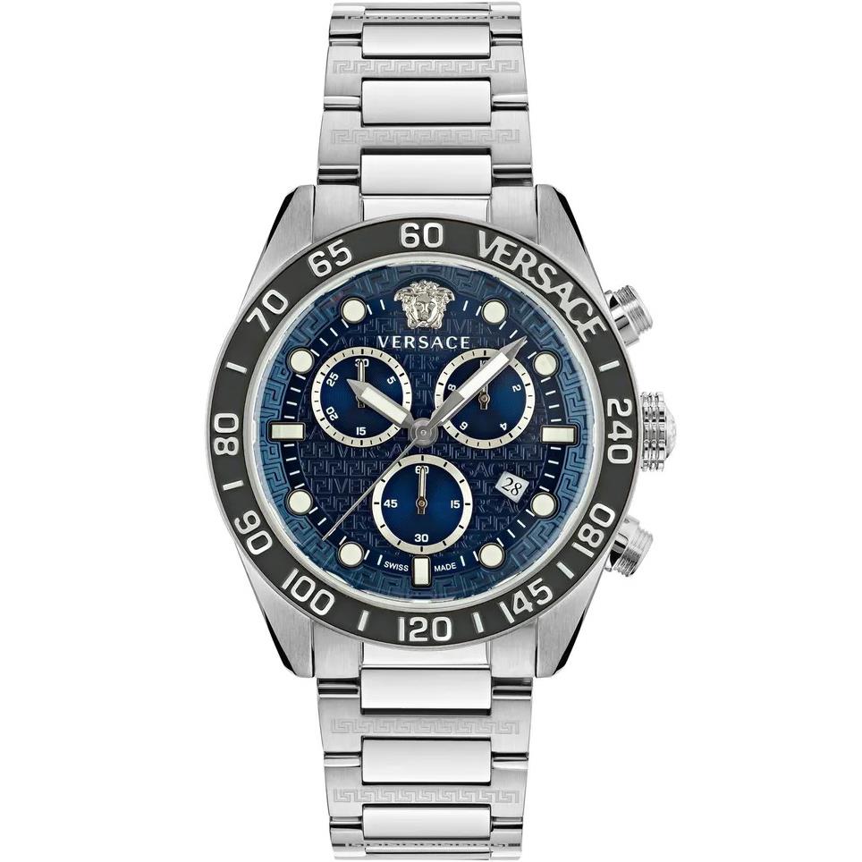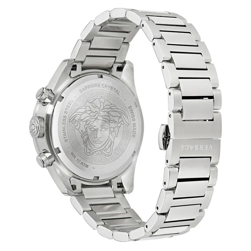 ساعت مچی مردانه Versace ورساچه با طراحی روزانه بند استیل, قاب مشکی استیل و صفحه گرد سرمه ای با شیشه ضد خراش و موتور سوئیسی با انرژی باتری و قابلیت داشتن کرنوگراف , شب نما , تقویم و مقاومت در برابر آب تا عمق 100متر به همراه دو سال گارانتی بین المللی