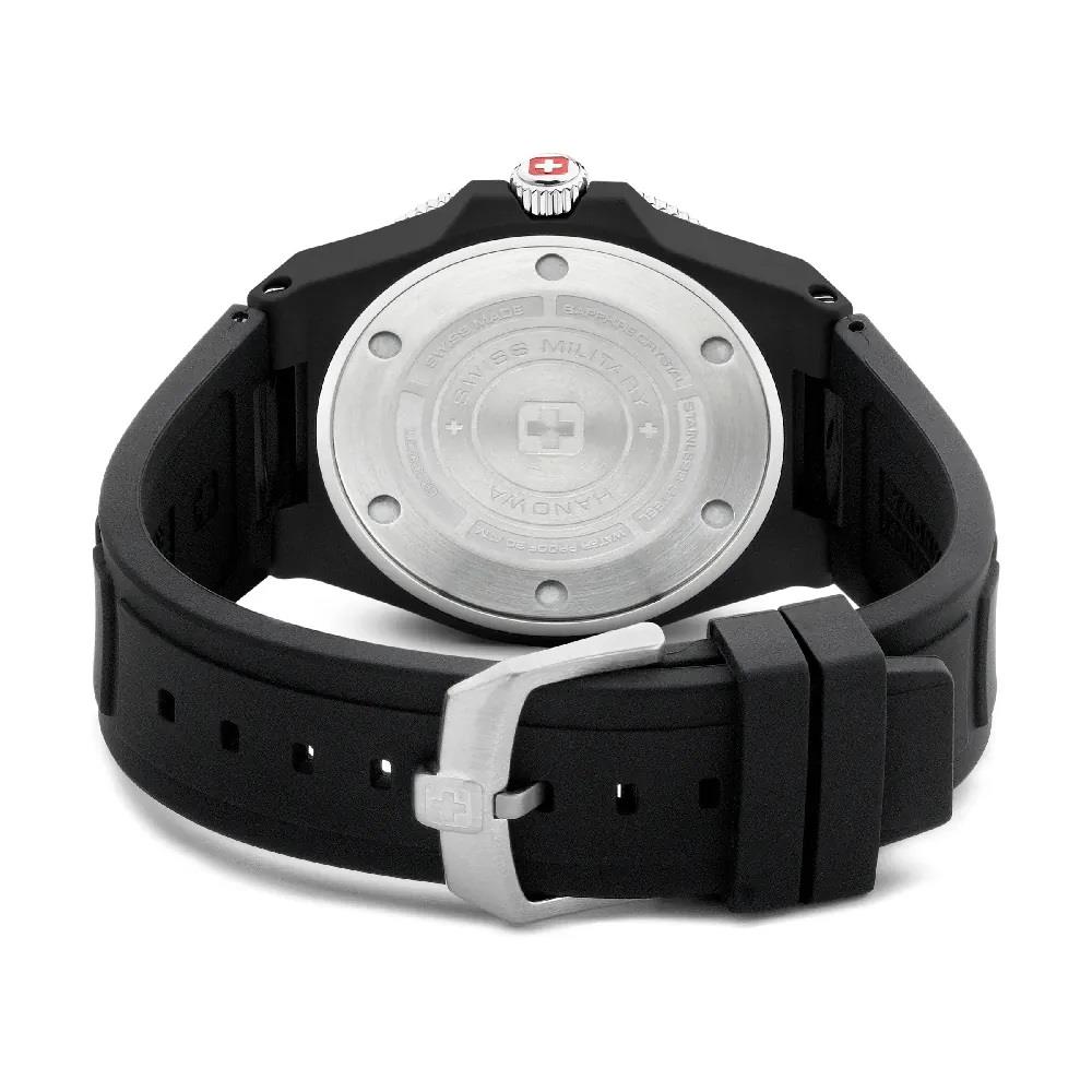 ساعت مچی مردانه سوییس میلیتاریswiss military با طراحی اسپرت بند سیلیکونی با قاب مشکی و صفحه گرد مشکی با شیشه ضد خراش و قابلیت داشتن تقویم / شب نما / زه چرخان و موتور سوییسی با انرژی باتری و مقاوم در برابر آب تا عمق 200 متر به همراه دو سال گارانتی بین المللی