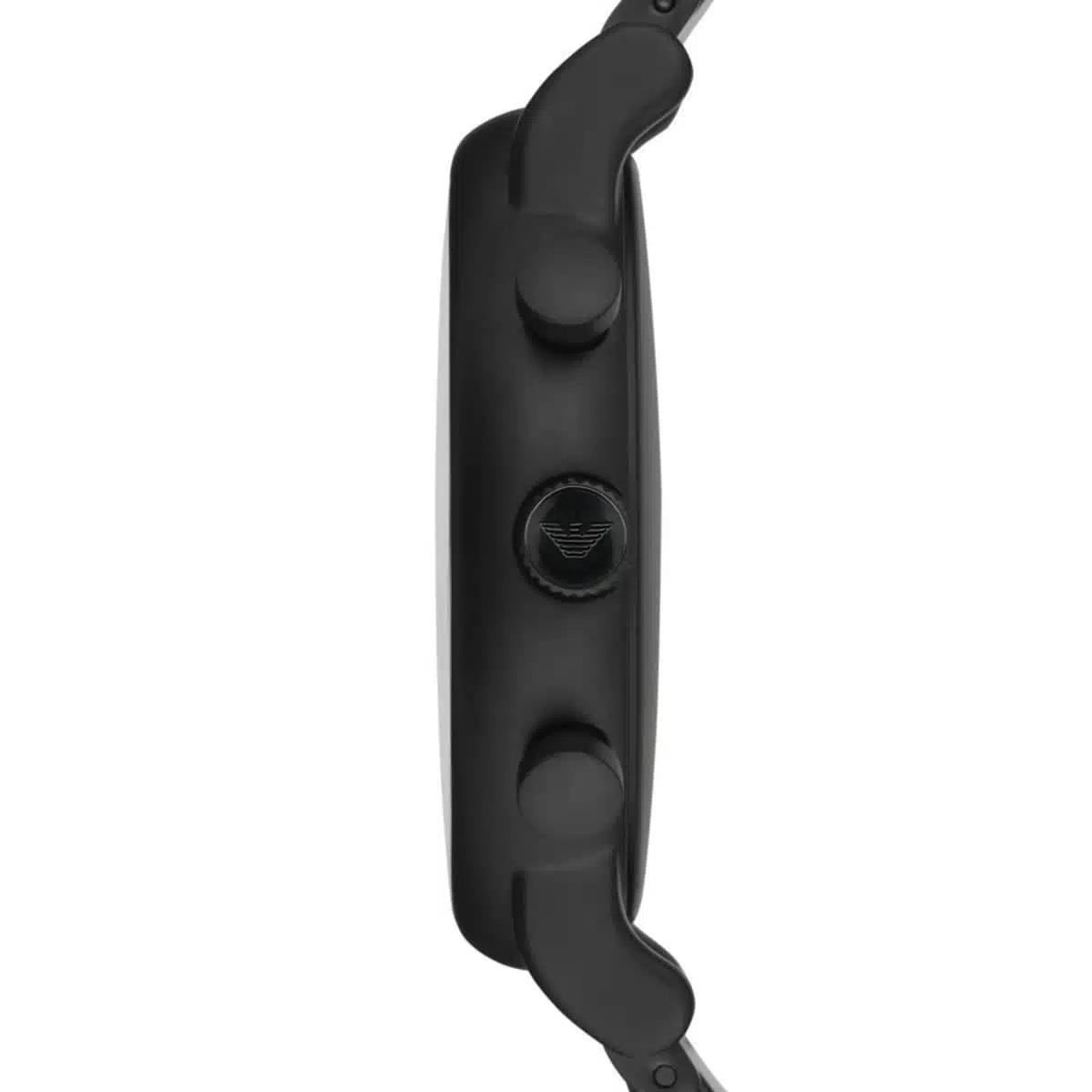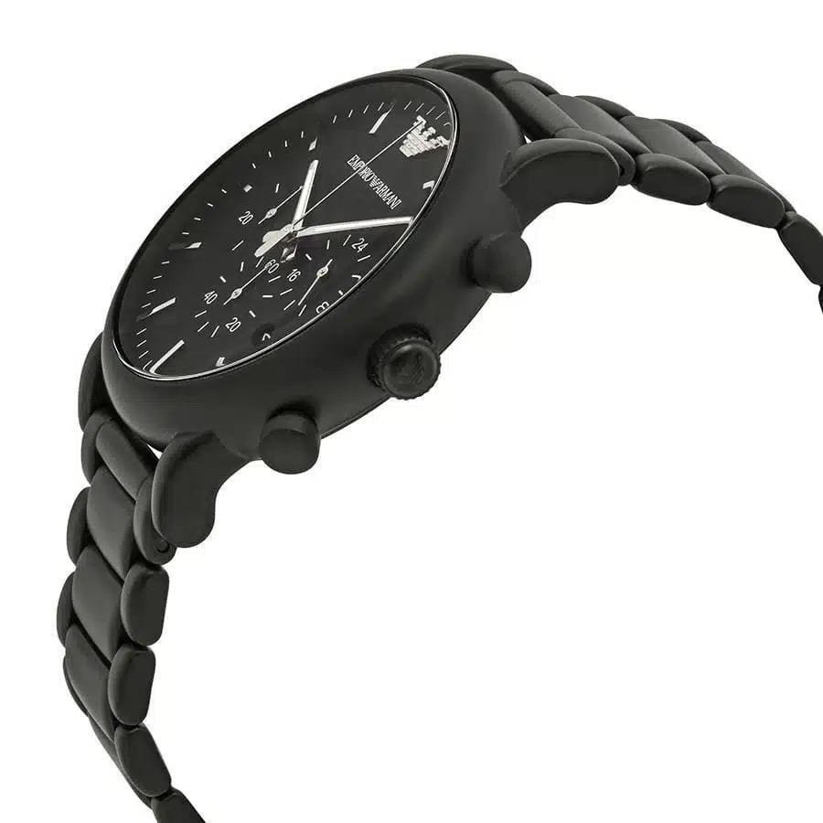 ساعت مچی مردانه  امپوریوآرمانی با طراحی اسپرت و بند فلزی مشکی و قاب فلزی مشکی با صفحه مشکی و قابلیت کرنوگراف , روز و شب , شب نما , تقویم با موتور ژاپنی و انرژی باطری و مقاوم در برابر آب تا عمق 50 متر به همراه دو سال گارانتی بین المللی