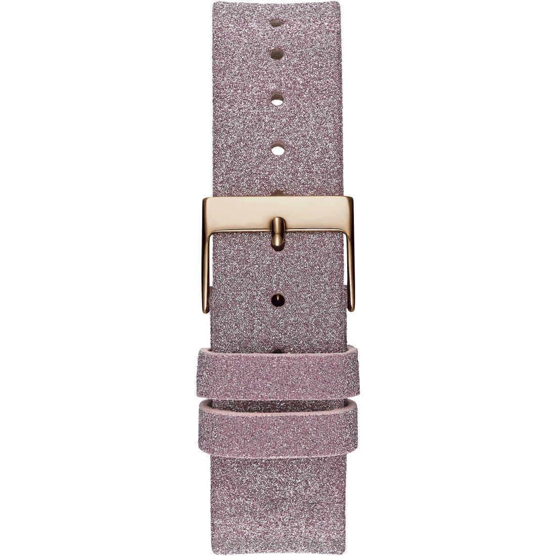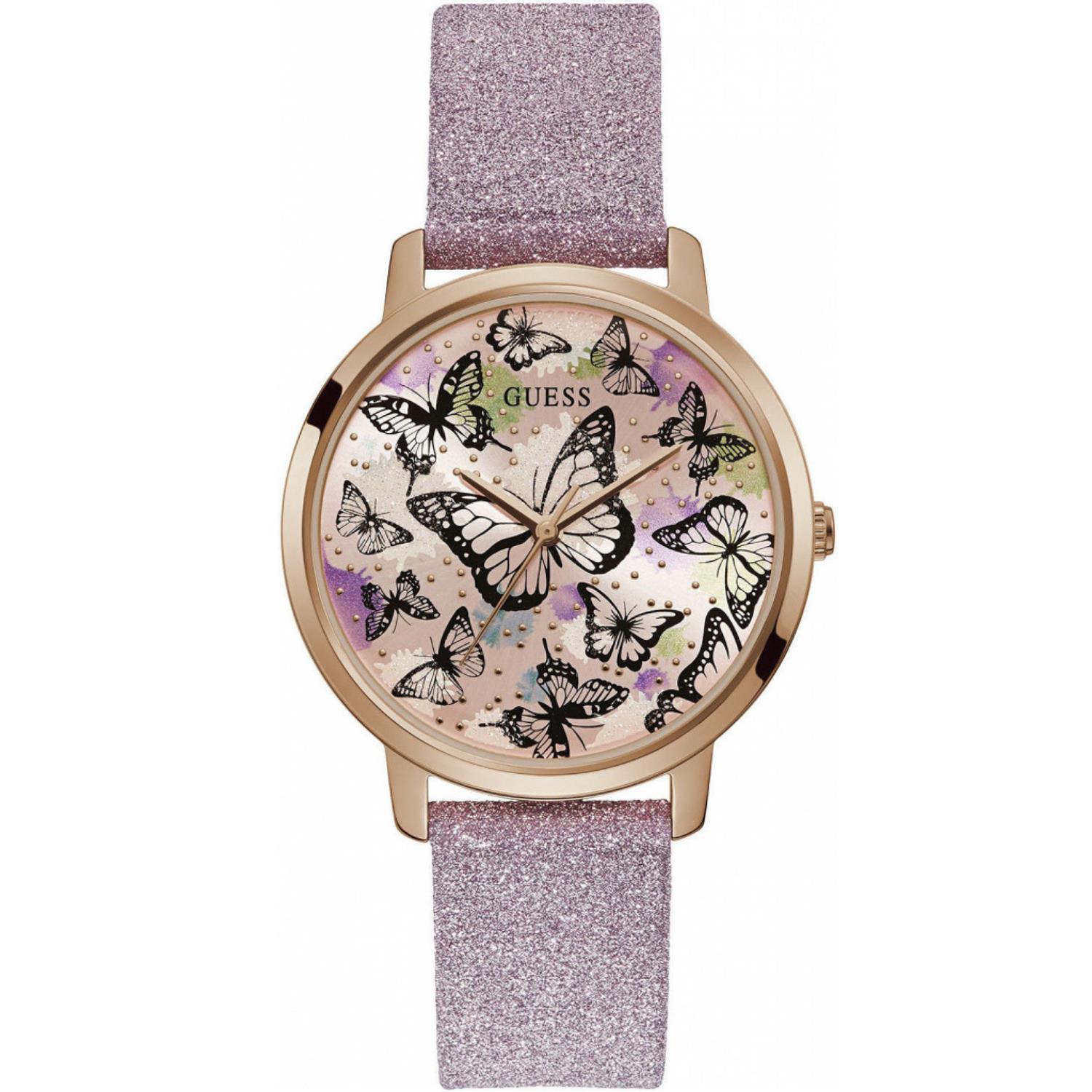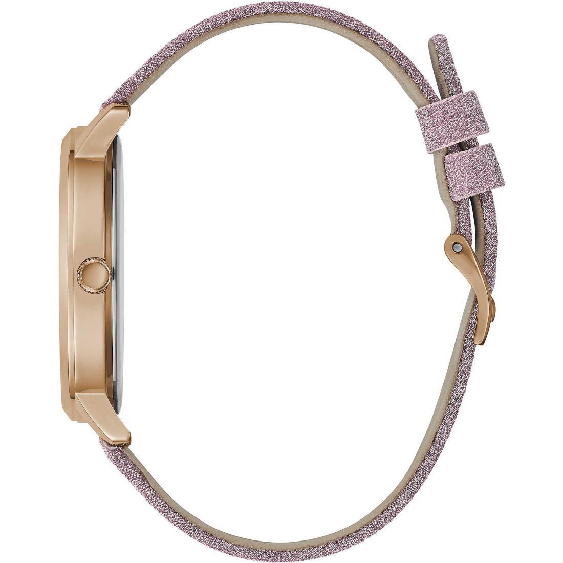 ساعت مچی زنانه گس GUESS با طراحی روزانه بند چرمی بنفش و قاب گرد مسی و صفحه طرح دار چند رنگ و موتور ژاپنی وانرژی باتری مقاومت در برابر آب تا عمق 30 متر به همراه دو سال گارانتی بین المللی