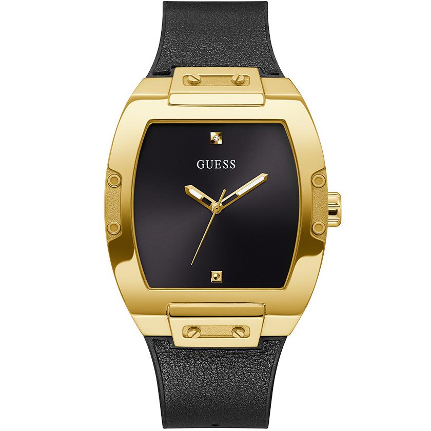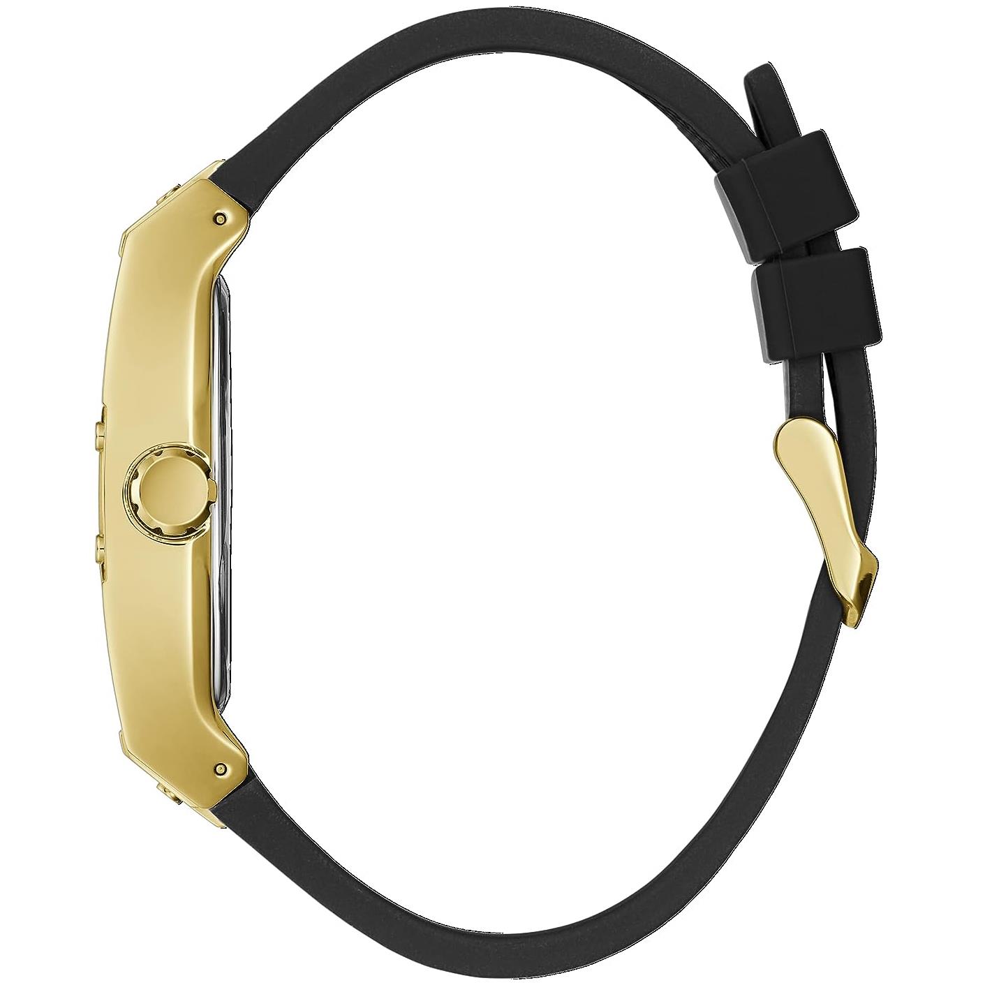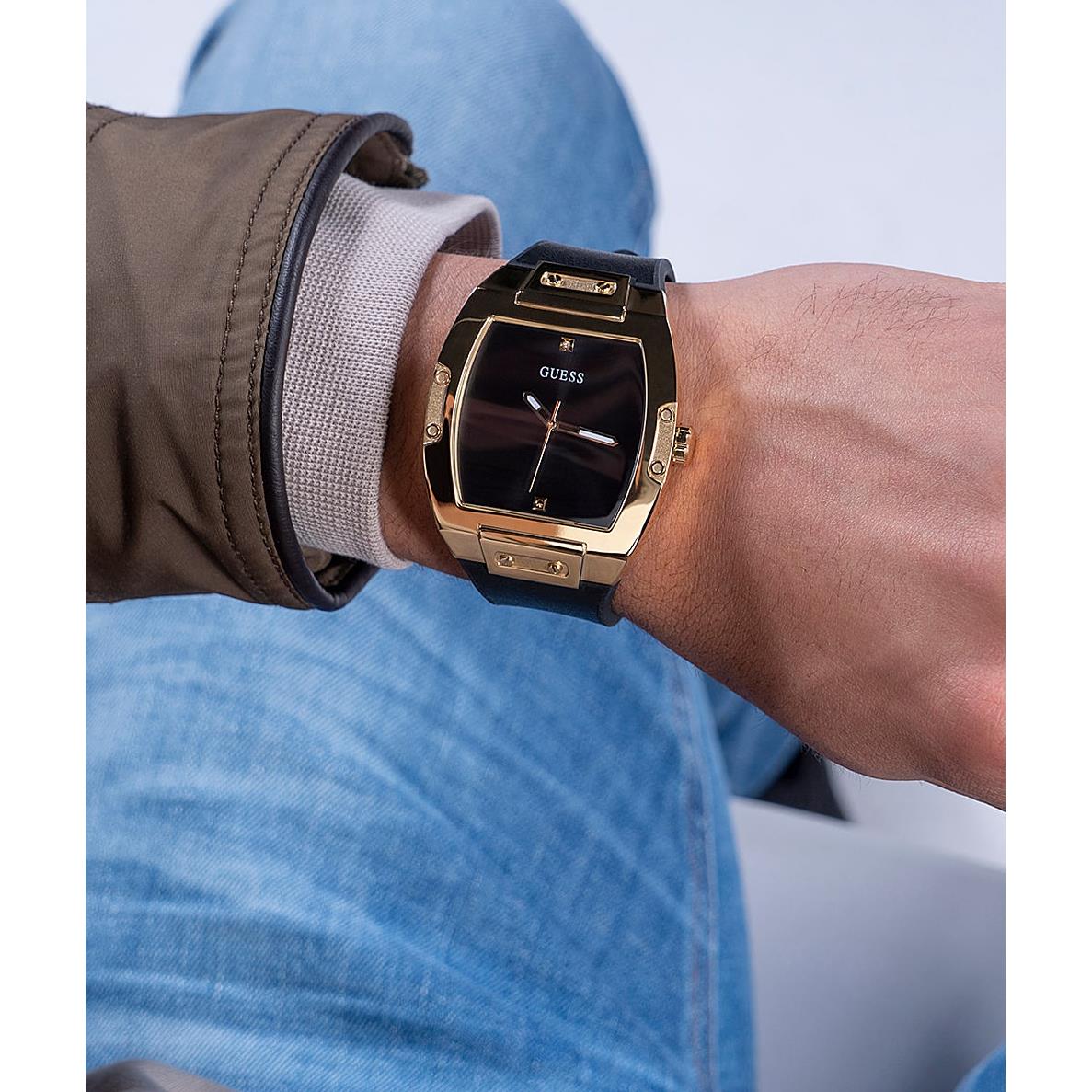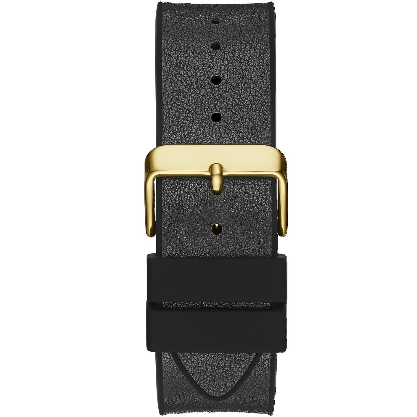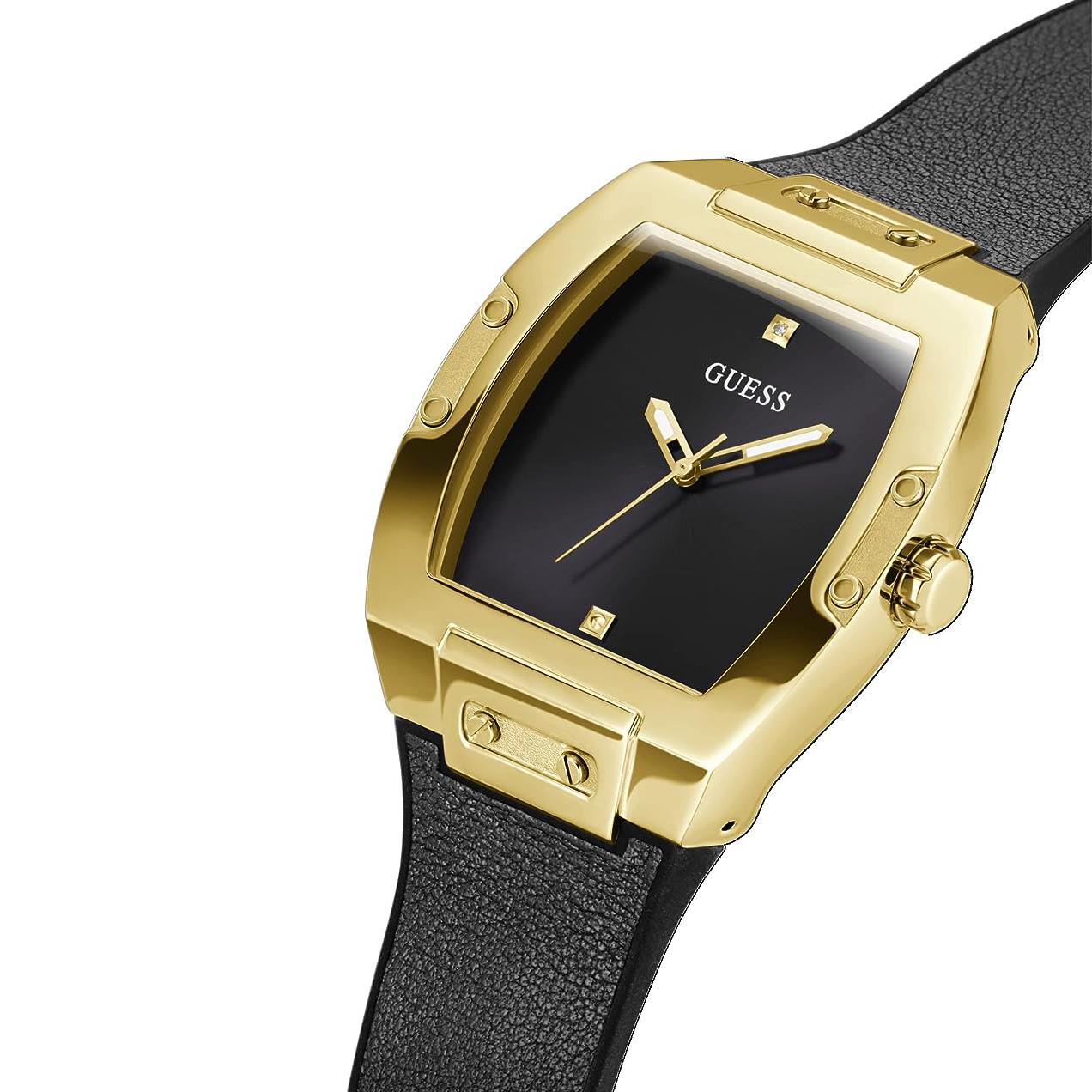 ساعت مچی مردانه گس GUESS با طراحی روزانه بند چرمی/سیلیکونی مشکی و قاب فلزی طلایی و صفحه نگین دار مشکی و موتور ژاپنی با انرژی باتری با قابلیت داشتن شب نما و مقاومت در برابر آب تا عمق 50 متر به همراه دو سال گارانتی بین المللی