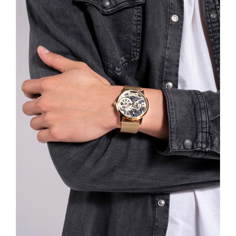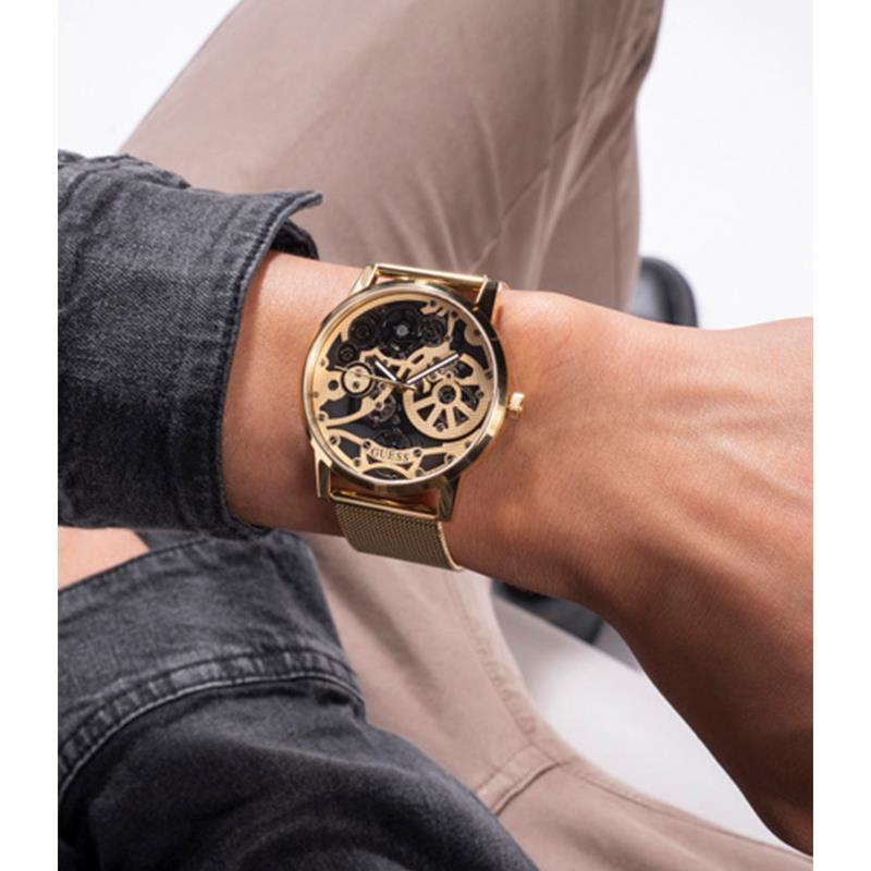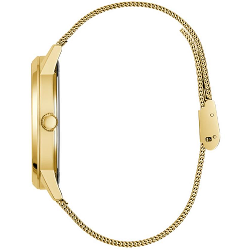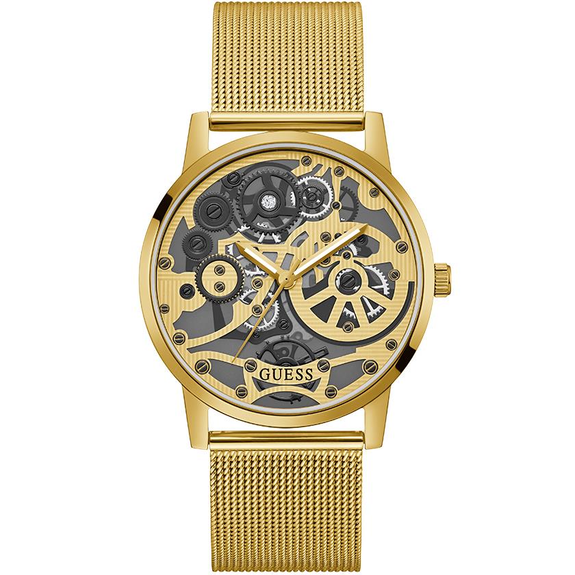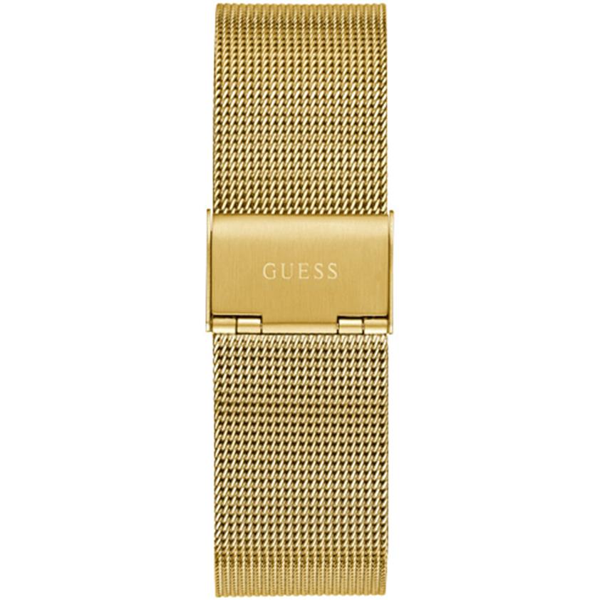 ساعت مچی مردانه گس GUESS با طراحی اسپرت بند حصیر بافت طلایی و قاب گرد فلزی طلایی و صفحه طلایی طوسی و موتور ژاپنی با انرژی باتری با قابلیت داشتن شب نما و مقاومت در برابر آب تا عمق 30 متر به همراه دو سال گارانتی بین المللی