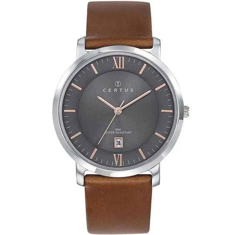 ساعت مچی مردانه سرتوس certus با طراحی کلاسیک بند چرمی قهوه ای و قاب اسیتل و صفحه گرد طوسی و قابلیت داشتن تقویم و موتور ژاپنی با انرژی باتری و مقاوم در برابر آب تا عمق 30 متر به همراه دو سال گارانتی بین المللی