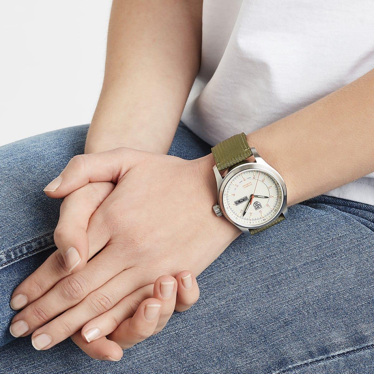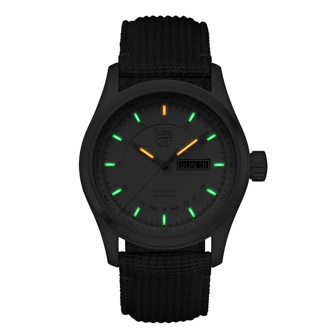 ساعت مچی مردانه لومینوکس luminox با طراحی روزانه بند برزنتی سبز و قاب گرد استیل با صفحه گرد سفید و شیشه ضد خراش و قابلیت داشتن تقویم / شب نما / روزهای هفته با موتور اتوماتیک سوِییسی و انرژی مکانیکی و مقاوم در برابر آب تا عمق 200 متر به همراه دو سال گارانتی بین المللی
