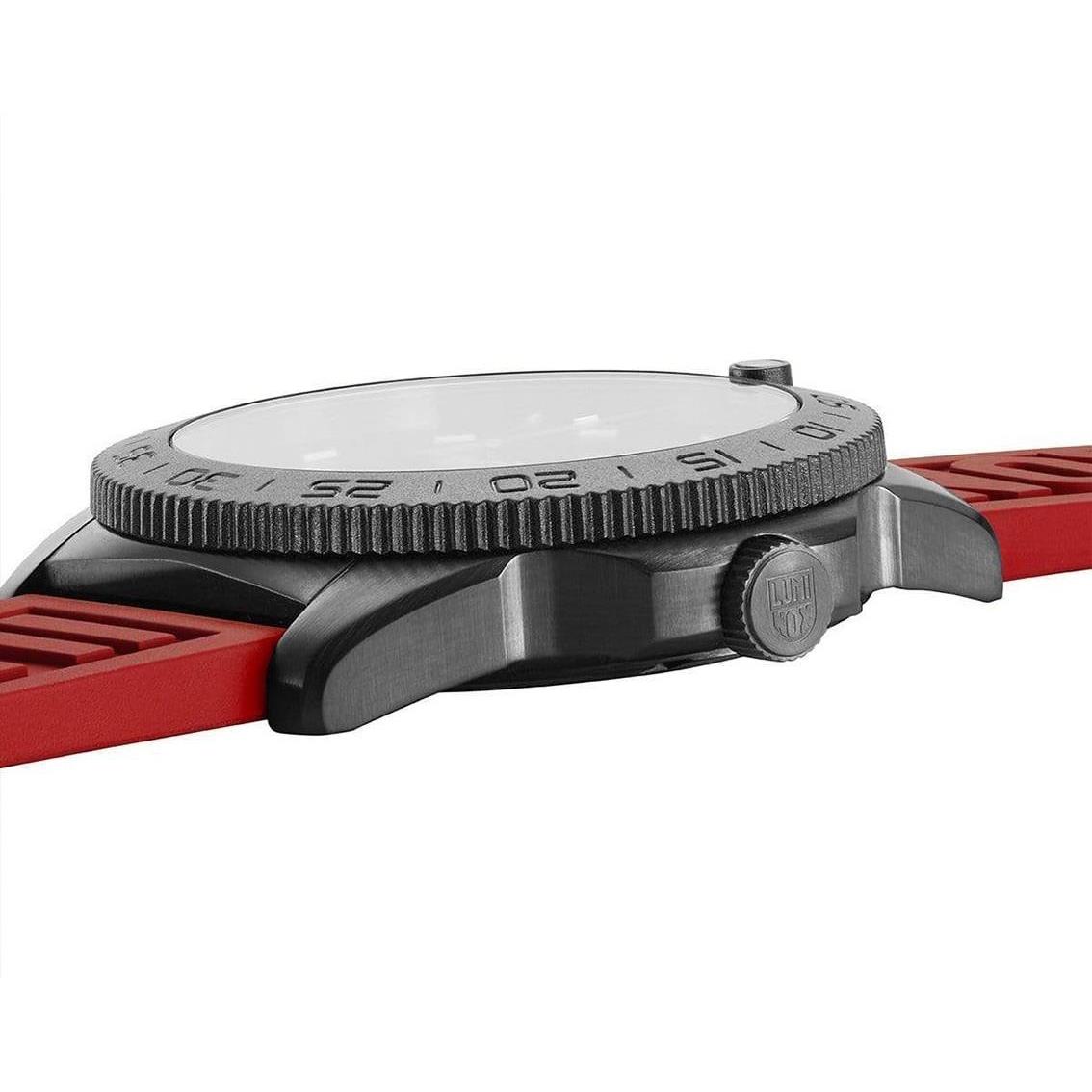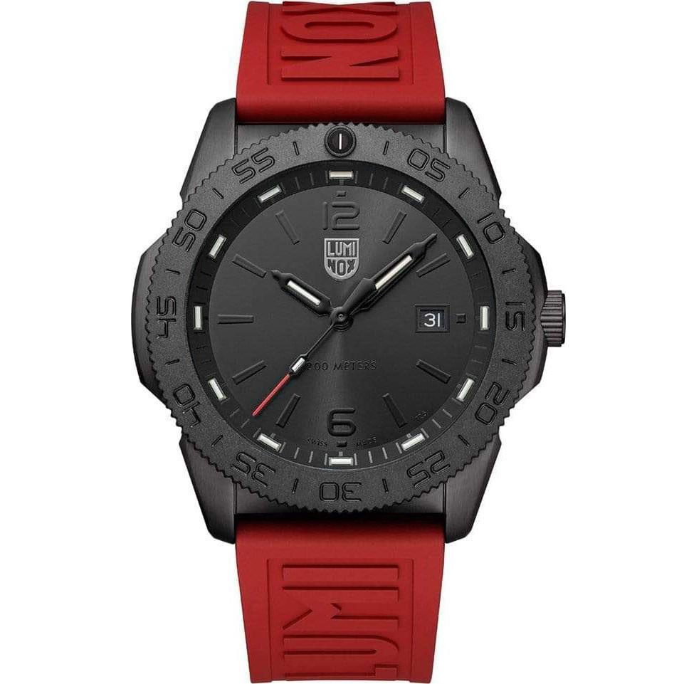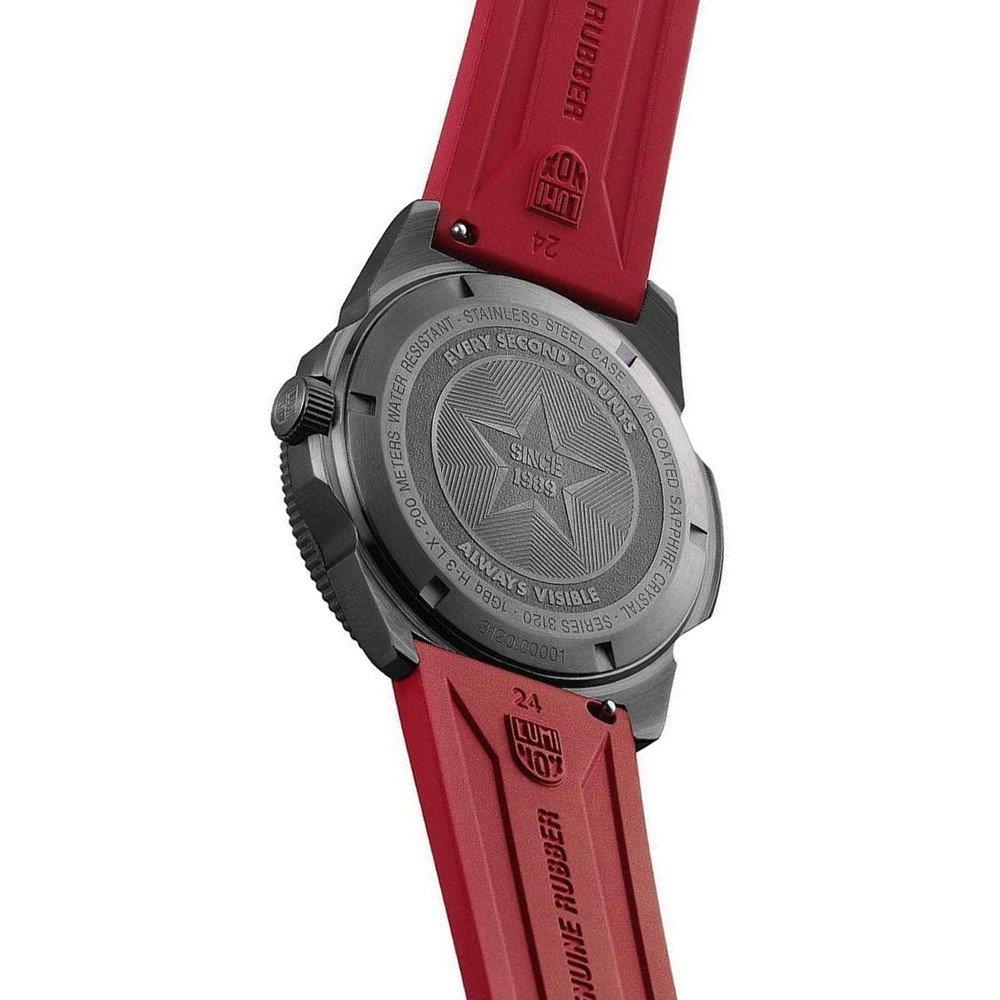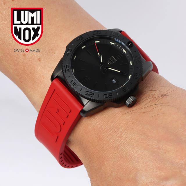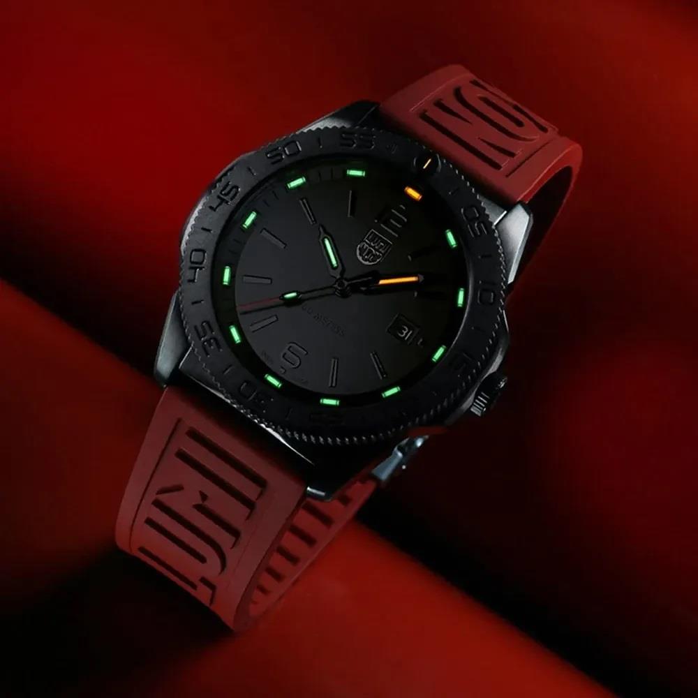 ساعت مچی مردانه لومینوکس luminox با طراحی روزانه بند سیلیکونی قرمز و قاب گرد مشکی با صفحه گرد مشکی و شیشه ضد خراش و ضد انعکاس نور و قابلیت داشتن تقویم / شب نما / زه چرخان با موتور سوِییسی و انرژی باتری و مقاوم در برابر آب تا عمق 200 متر به همراه دو سال گارانتی بین المللی