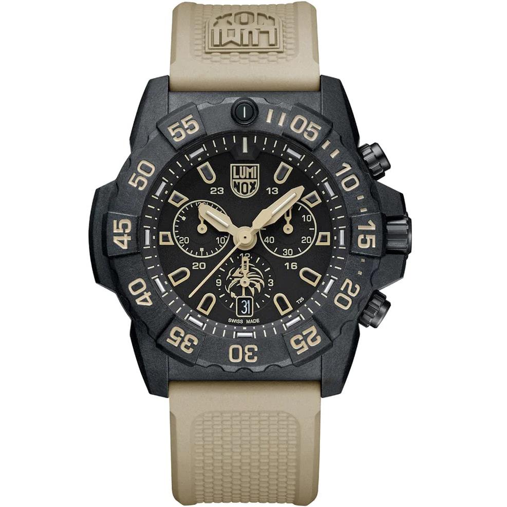 ساعت مچی مردانه لومینوکس luminox با طراحی اسپرت بند سیلیکونی کرم و قاب گرد مشکی با صفحه مشکی و قابلیت داشتن تقویم / شب نما / زه چرخان /کرنوگراف و موتور سوِییسی و انرژی باتری و مقاوم در برابر آب تا عمق 200 متر با ضمیمه بند برزنتی داخل جعبه به همراه دو سال گارانتی بین المللی