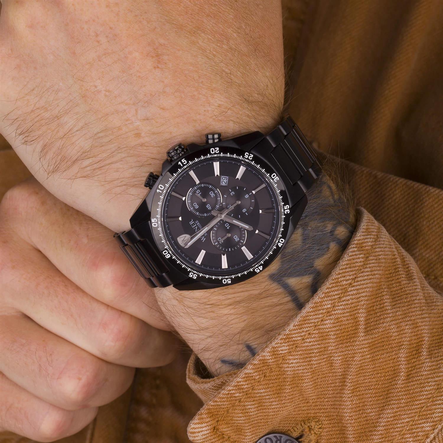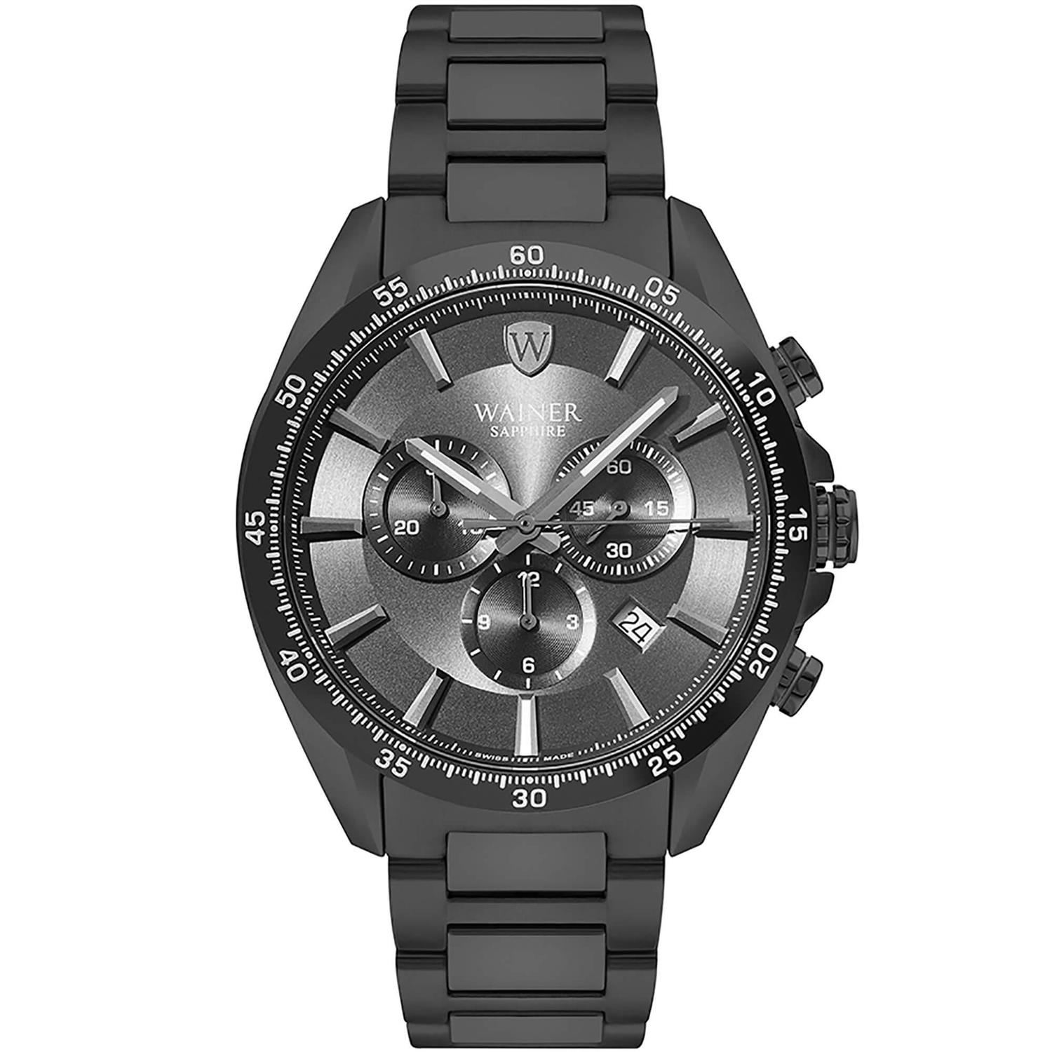 ساعت مچی مردانه واینر WAINER با طراحی روزانه بند فلزی مشکی با قاب فلزی مشکی و صفحه گرد مشکی با قابلیت داشتن تقویم /کرنوگراف / شب نما و موتور سوییسی با انرژی باطری و مقاوم در برابر آب تا عمق 100 متر به همراه دو سال گارانتی بین المللی
