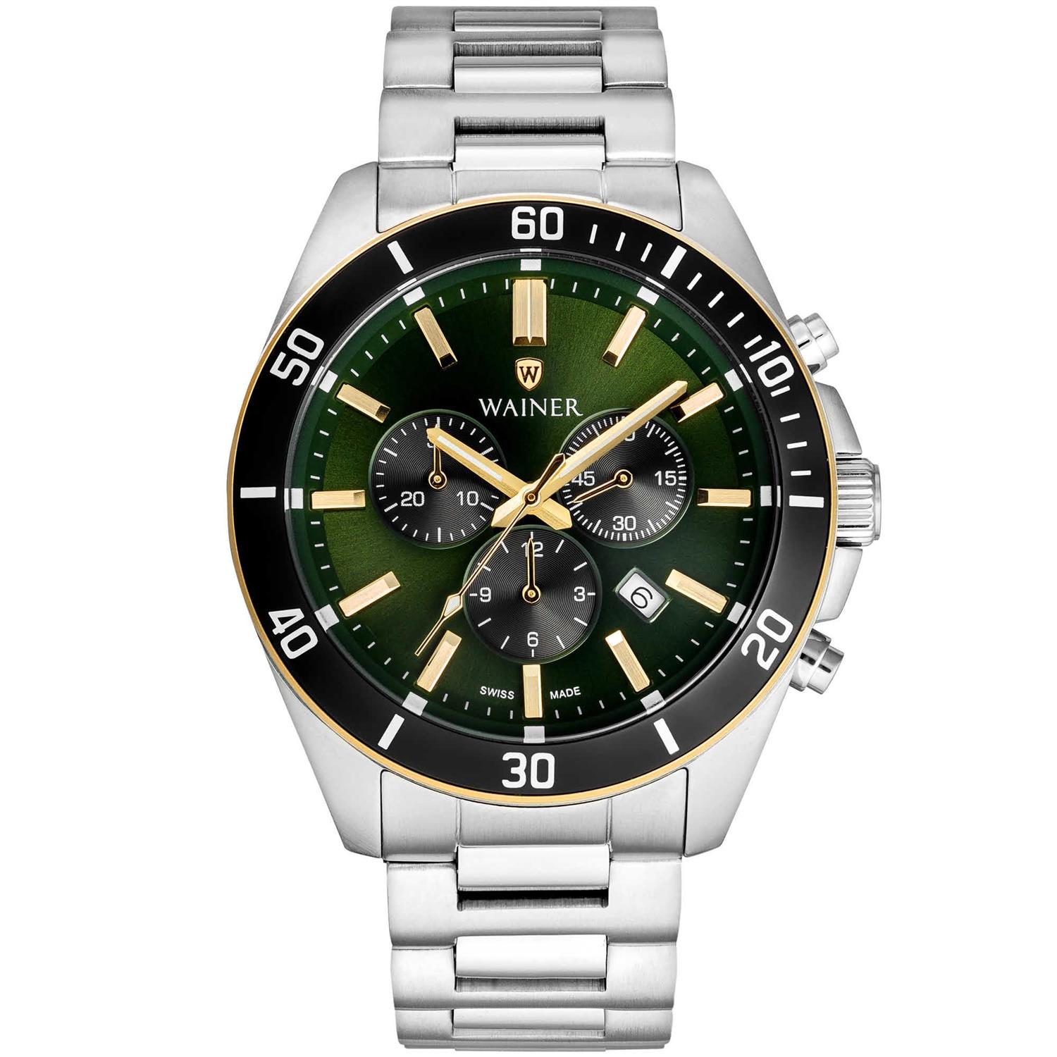 ساعت مچی مردانه واینر WAINER با طراحی روزانه بند استیل با قاب گرد استیل مشکی مسی و صفحه گرد سبز با قابلیت داشتن شب نما /کرنوگراف /شب نما و موتور سوییسی با انرژی باطری و مقاوم در برابر آب تا عمق 100 متر به همراه دو سال گارانتی بین المللی