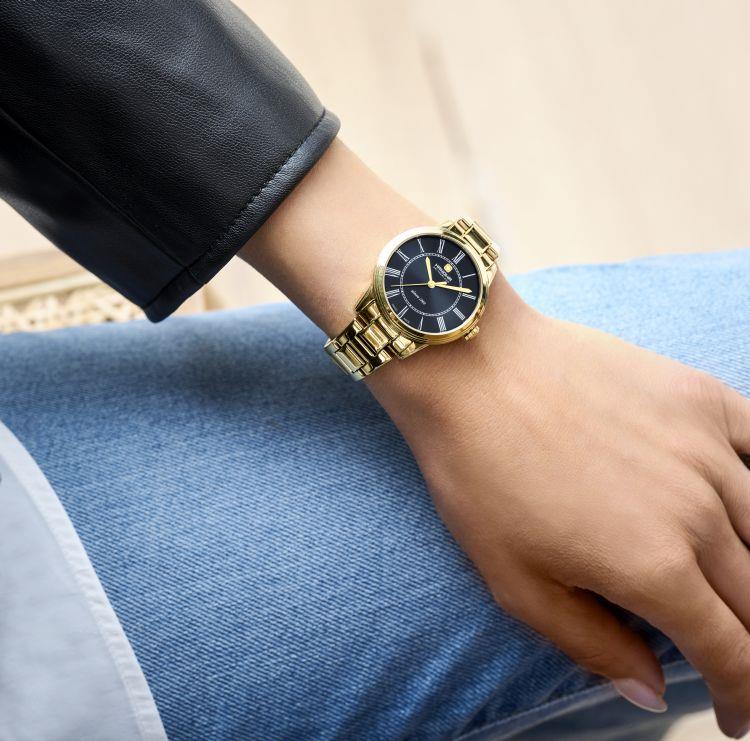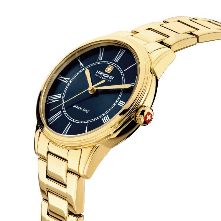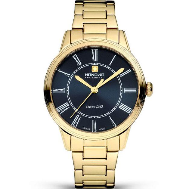 ساعت مچی زنانه هانوا HANOWA با طراحی کلاسیک بند فلزی طلایی با قاب فلزی طلایی و صفحه گرد سرمه ای و موتور سوییسی با انرژی باتری و مقاوم در برابر آب تا عمق 50 متر به همراه دو سال گارانتی بین المللی