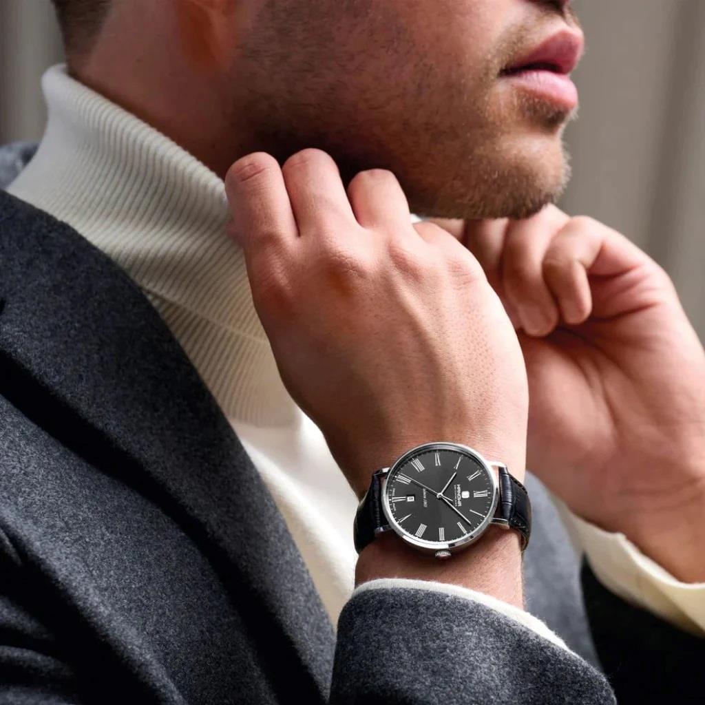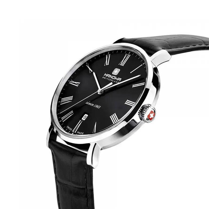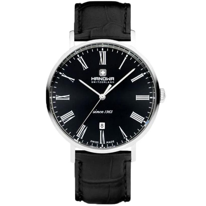 ساعت مچی مردانه هانوا HANOWA با طراحی کلاسیک بند چرمی مشکی با قاب استیل و صفحه مشکی با قابلیت داشتن تقویم و موتور سوییسی با انرژی باتری و مقاوم در برابر آب تا عمق 50 متر به همراه دو سال گارانتی بین المللی