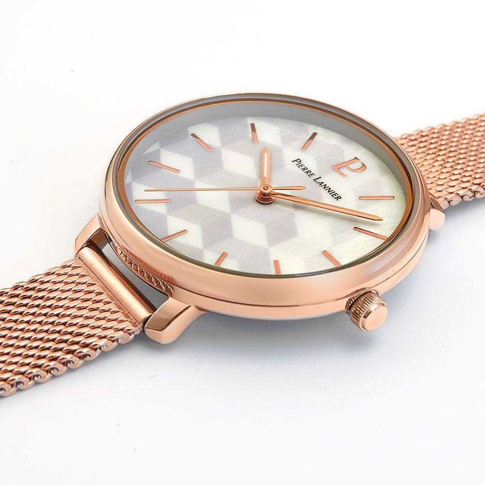 ساعت مچی زنانه پیرلنیرpierre lannier با طراحی روزانه بند حصیر بافت مسی و قاب فلزی مسی و صفحه گرد طوسی و قابلیت داشتن شب نما با موتور ژاپنی با انرژی باتری و مقاوم در برابر آب تا عمق 30 متر به همراه گارانتی بین المللی
