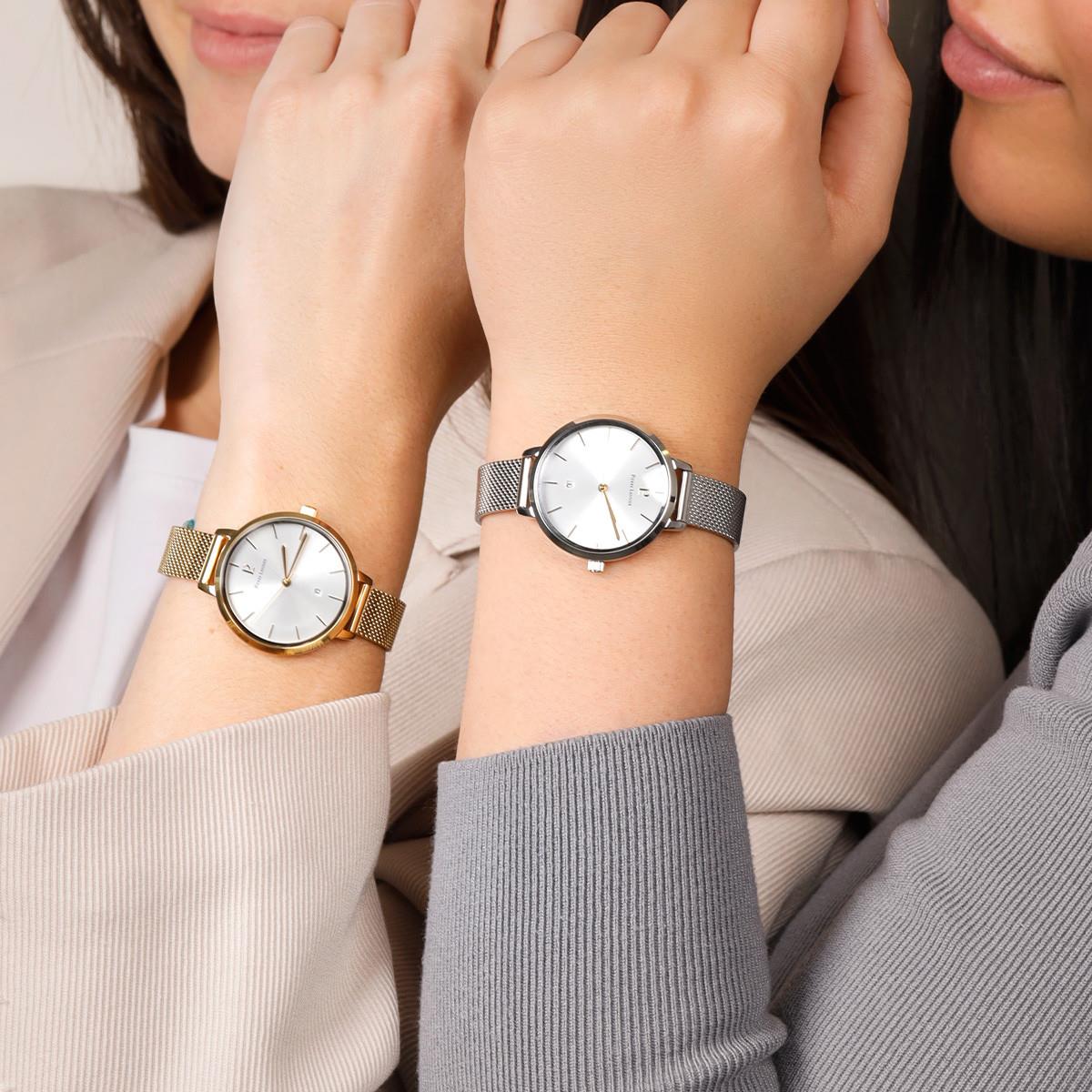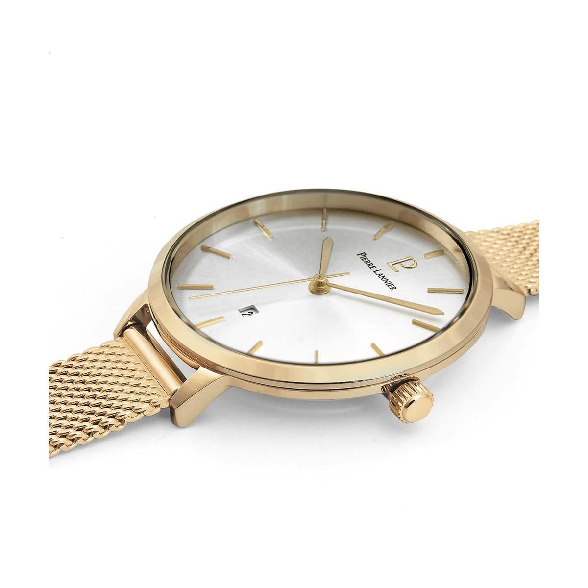 ساعت مچی زنانه پیرلنیرpierre lannier با طراحی روزانه بند حصیر بافت طلایی و قاب گرد طلایی و صفحه گرد نقره ای وقابلیت داشتن تقویم , موتور ژاپنی با انرژی باتری و مقاوم در برابر آب تا عمق 50 متر به همراه گارانتی بین المللی