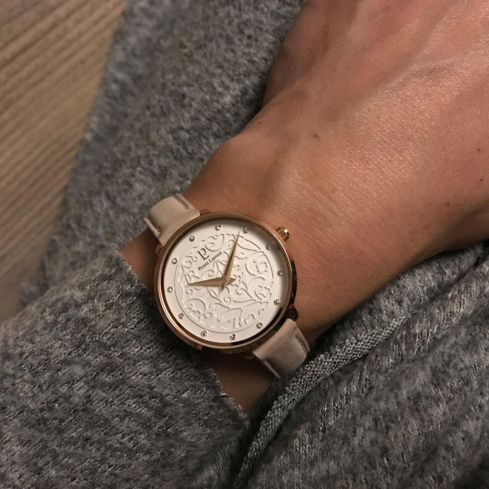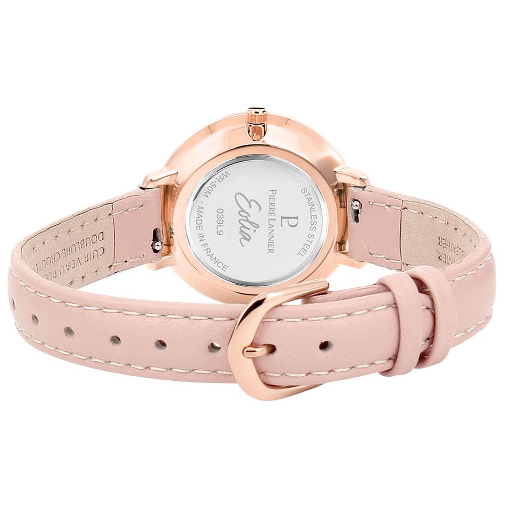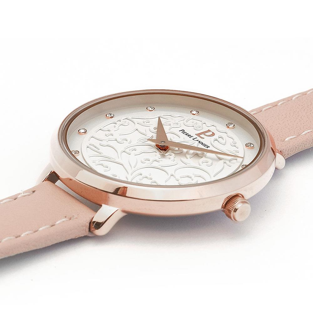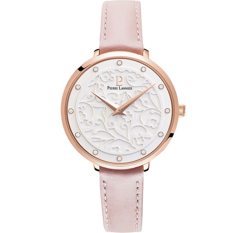 ساعت مچی زنانه پیرلنیرpierre lannier با طراحی روزانه بند چرمی سفید و قاب گرد  فلزی مسی و صفحه نگین دار سفید و موتور ژاپنی با انرژی باتری و مقاوم در برابر آب تا عمق 50 متر به همراه گارانتی بین المللی