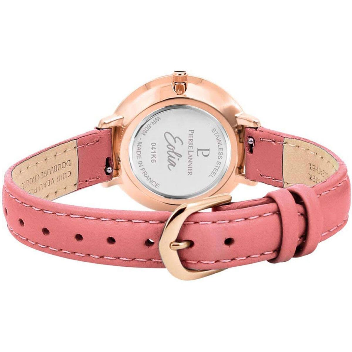 ساعت مچی زنانه پیرلنیر pierre lannier با طراحی روزانه بند چرمی صورتی و قاب گرد فلزی مسی و صفحه نگین دار سفید و موتور ژاپنی با انرژی باتری و مقاوم در برابر آب تا عمق 50 متر به همراه  گارانتی بین المللی
