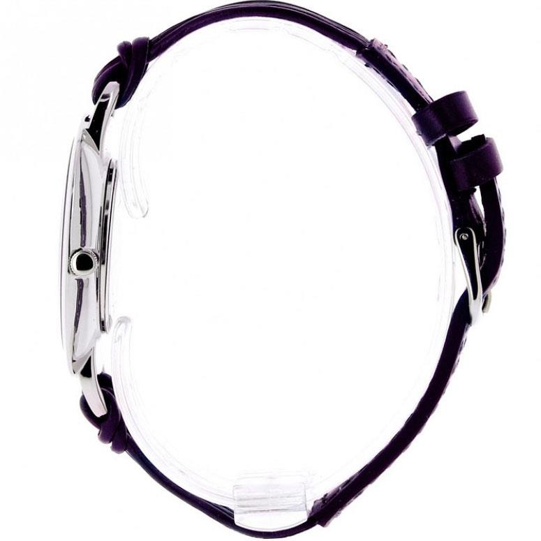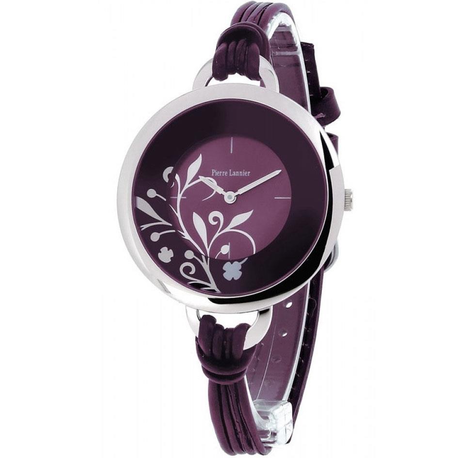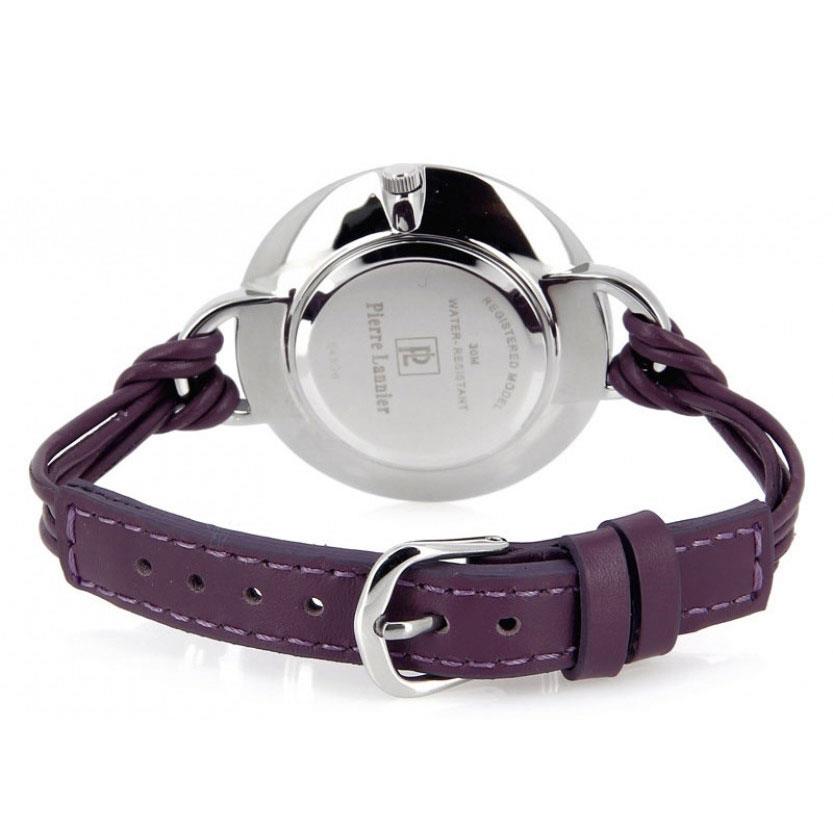 ساعت مچی زنانه پیرلنیر pierre lannier با طراحی روزانه بند چرمی بنفش و قاب گرد استیل و صفحه بنفش و موتور ژاپنی با انرژی باتری و مقاوم در برابر آب تا عمق 30 متر به همراه گارانتی بین المللی