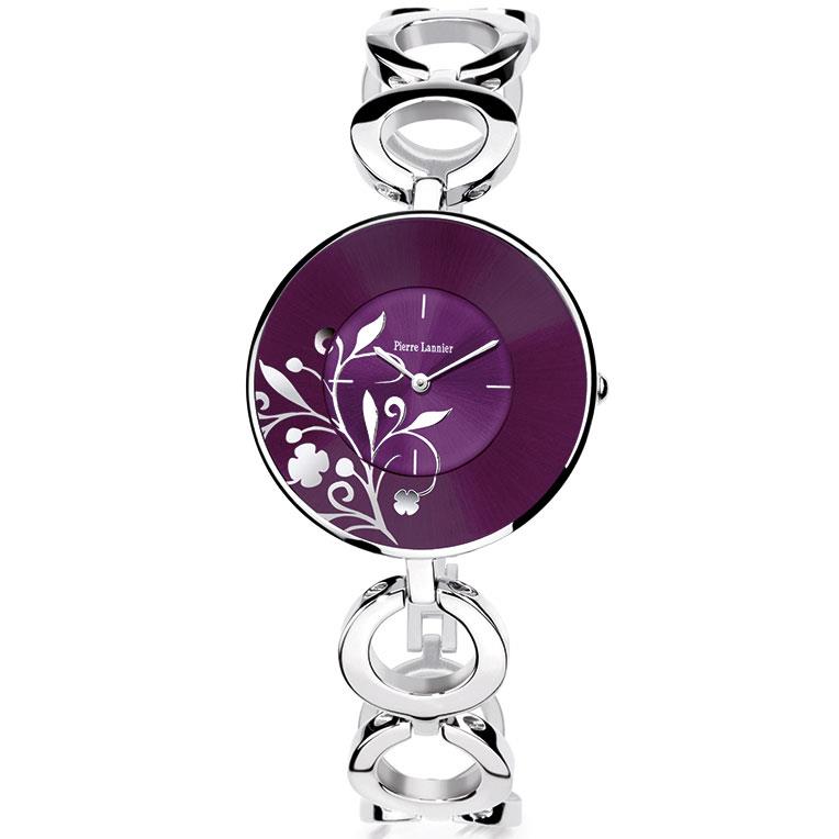 ساعت مچی زنانه پیرلنیر pierre lannier با طراحی روزانه بند استیل و قاب گرد استیل و صفحه گرد بنفش و موتور ژاپنی با انرژی باتری و مقاوم در برابر آب تا عمق 30 متر به همراه گارانتی بین المللی