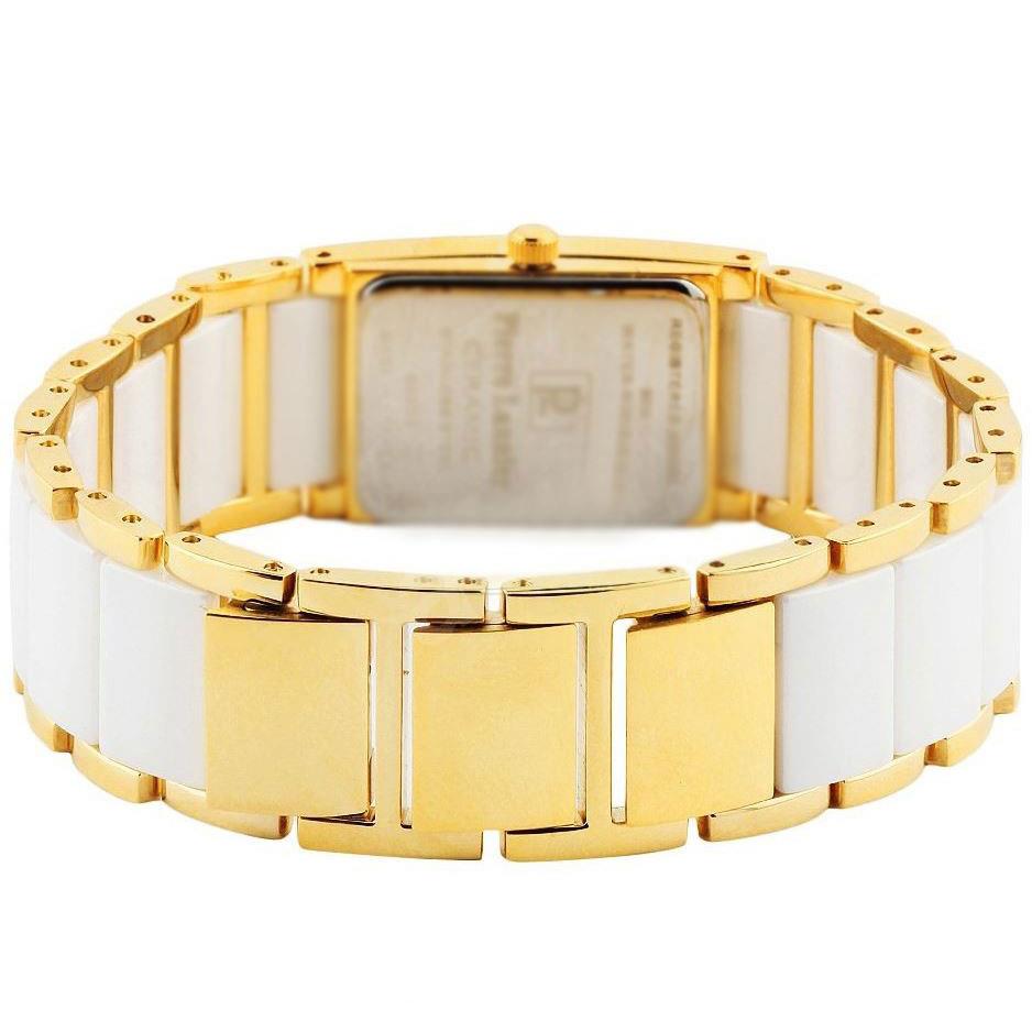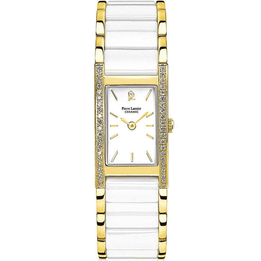 ساعت مچی زنانه پیرلنیر pierre lannier با طراحی روزانه بند استیل سرامیک و قاب نگین فلزی طلایی و صفحه مستطیل سفید و موتور ژاپنی با انرژی باتری و مقاوم در برابر آب تا عمق 30 متر به همراه گارانتی بین المللی
