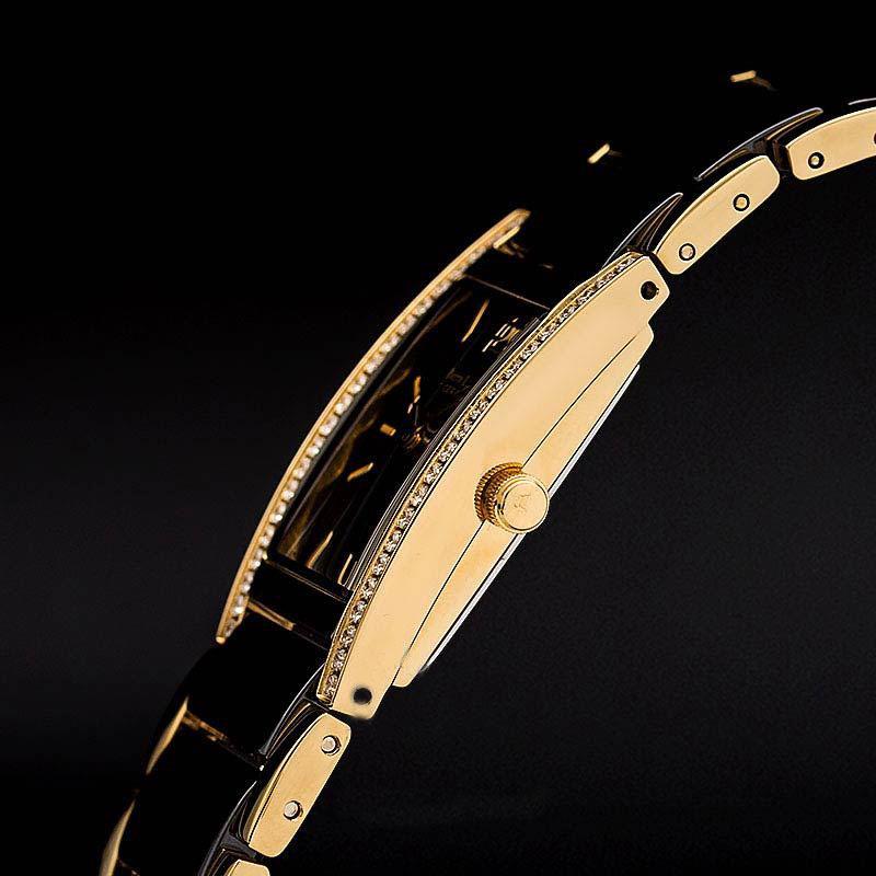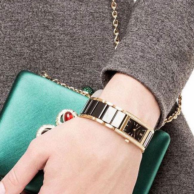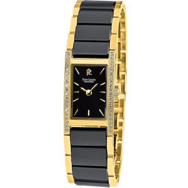 ساعت مچی زنانه پیرلنیر pierre lannier با طراحی روزانه بند استیل سرامیک و قاب نگین فلزی طلایی و صفحه مستطیل مشکی و موتور ژاپنی با انرژی باتری و مقاوم در برابر آب تا عمق 30 متر به همراه گارانتی بین المللی