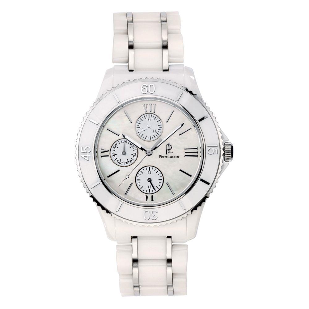 ساعت مچی زنانه پیرلنیرpierre lannier با طراحی روزانه بند سرامیک استیل و قاب گرد استیل سرامیک و صفحه گرد سفید صدفی با قابلیت داشتن تقویم/ روز وشب/ روزهای هفته /شب نما / زه چرخان و موتور ژاپنی با انرژی باتری و مقاوم در برابر آب تا عمق 30 متر به همراه گارانتی بین المللی