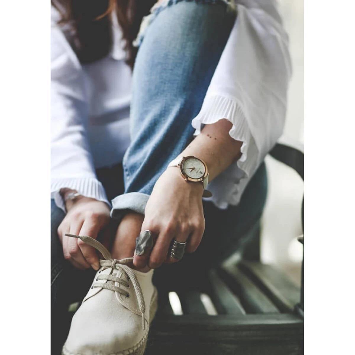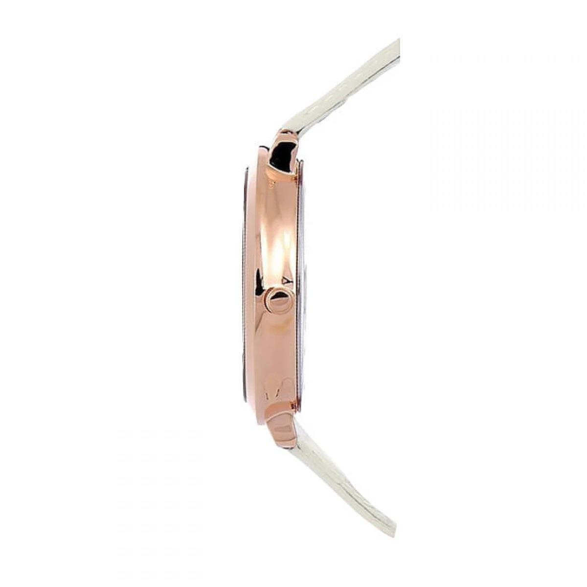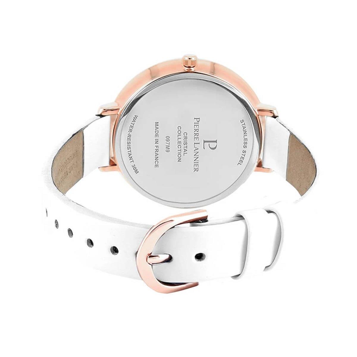 ساعت مچی زنانه پیرلنیر pierre lannier با طراحی کلاسیک بند چرمی سفید و قاب گرد مسی و صفحه نگین دار سفید و موتور ژاپنی با انرژی باتری و مقاوم در برابر آب تا عمق 30 متر به همراه گارانتی بین المللی