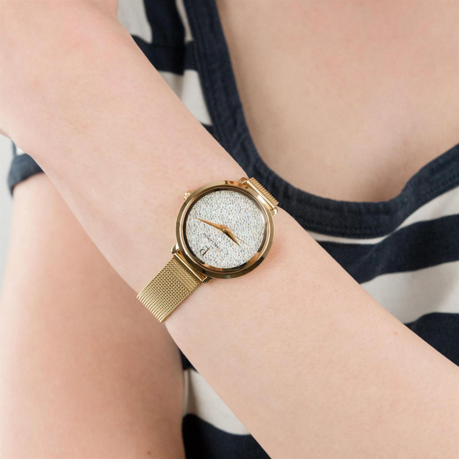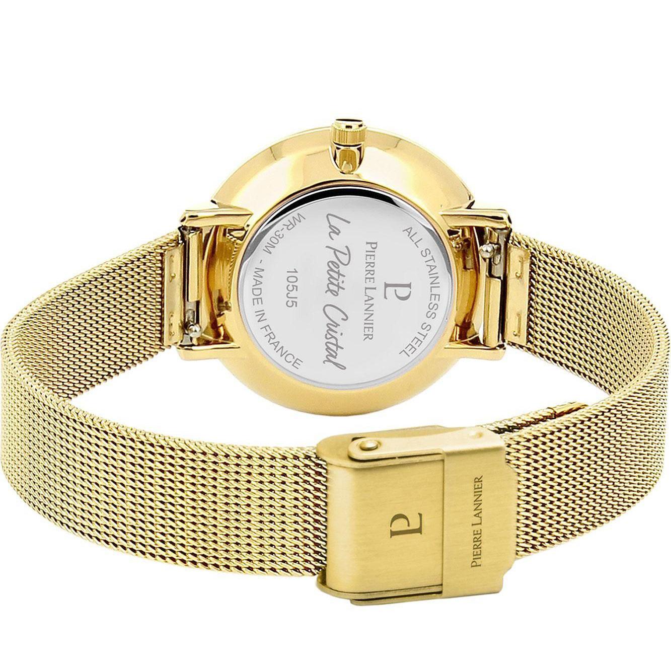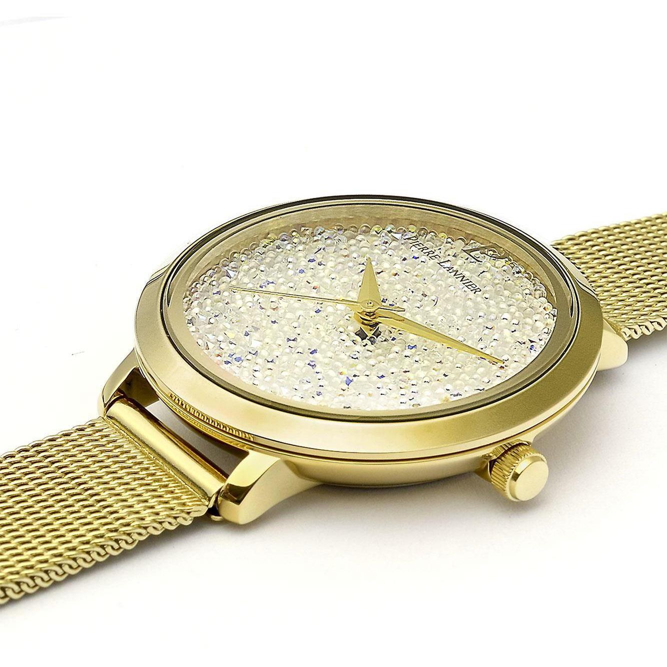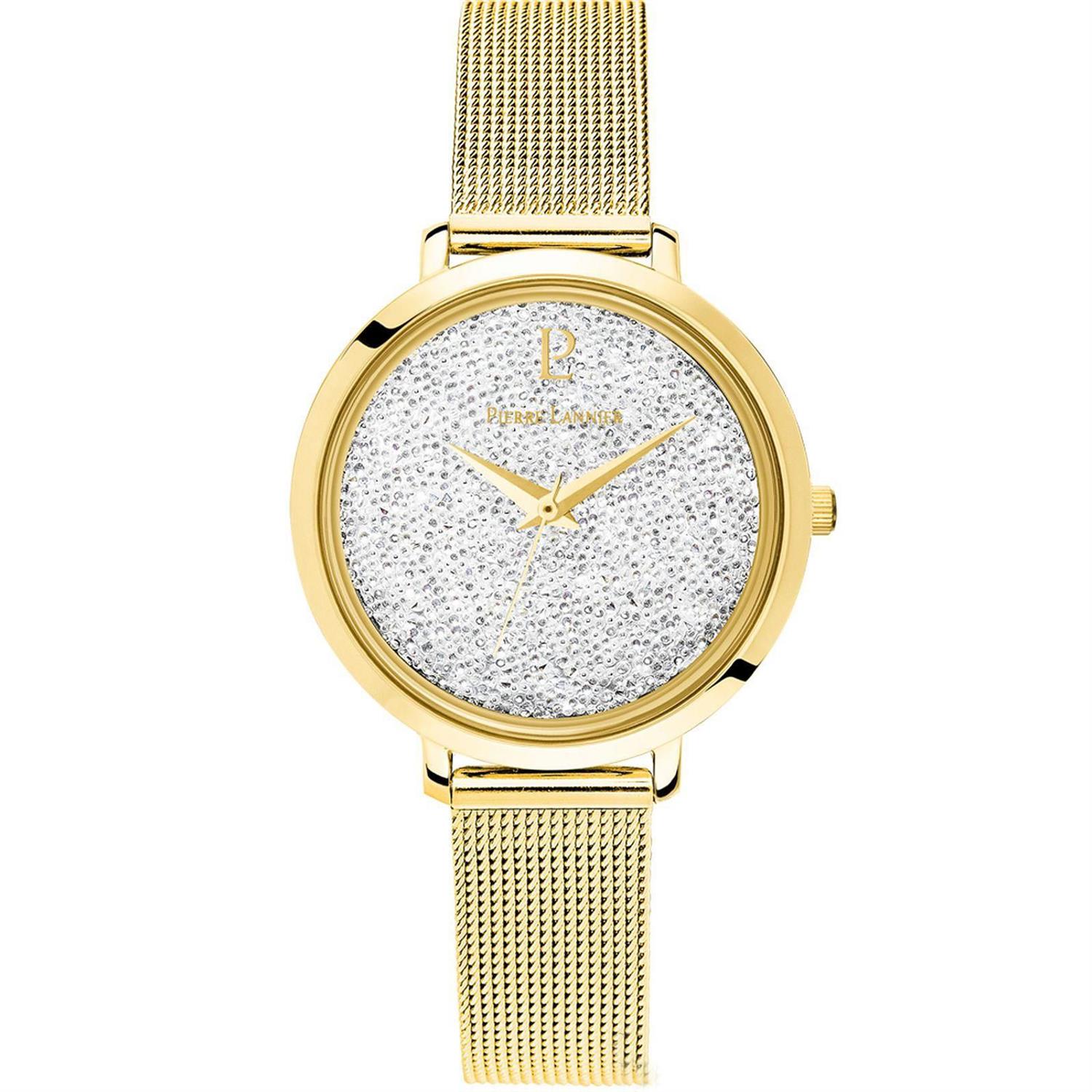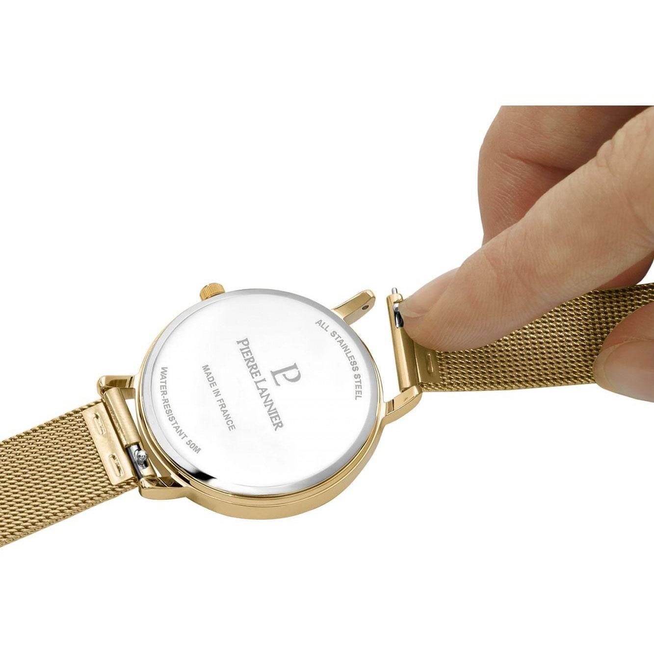 ساعت مچی زنانه پیرلنیر pierre lannier با طراحی کلاسیک بند حصیر بافت طلایی و قاب گرد طلایی و صفحه گرد سفید و موتور ژاپنی با انرژی باتری و مقاوم در برابر آب تا عمق 30 متر به همراه گارانتی بین المللی