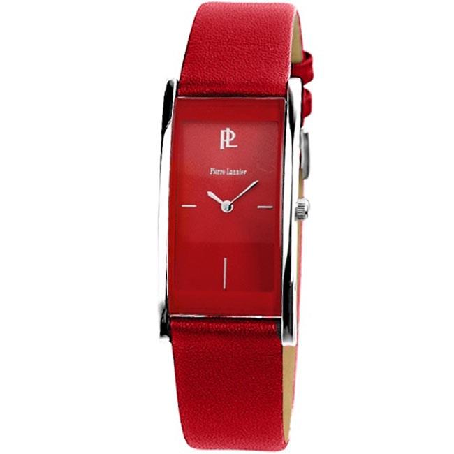 ساعت مچی زنانه پیرلنیرpierre lannier با طراحی روزانه بند چرمی قرمز و قاب مستطیل استیل و صفحه مستطیل قرمز و موتور ژاپنی با انرژی باتری و مقاوم در برابر آب تا عمق 30 متر به همراه گارانتی بین المللی