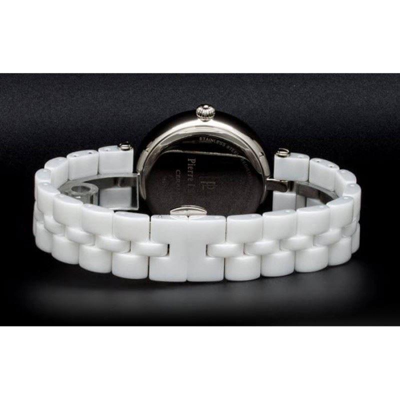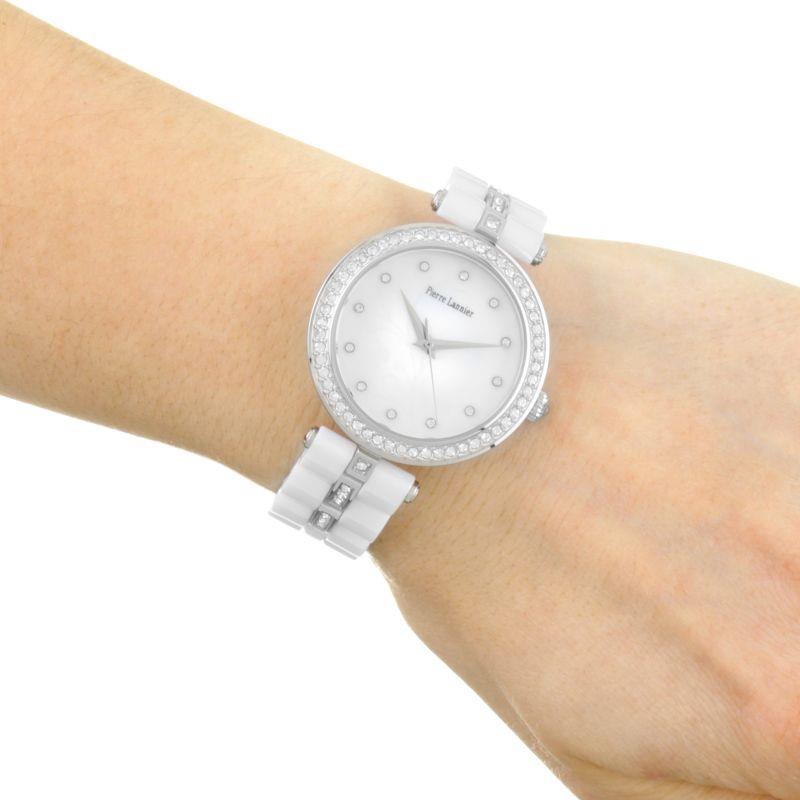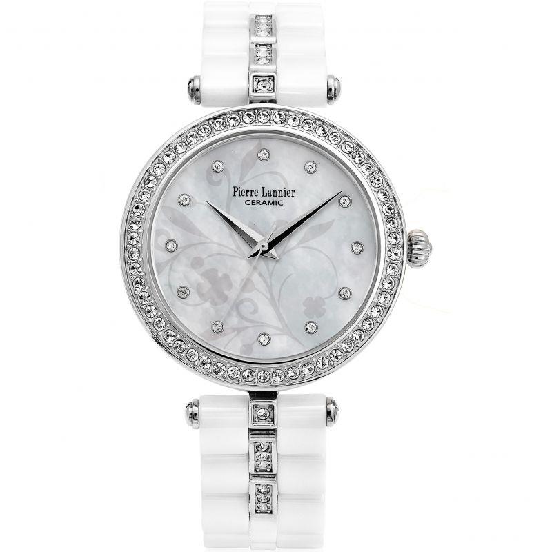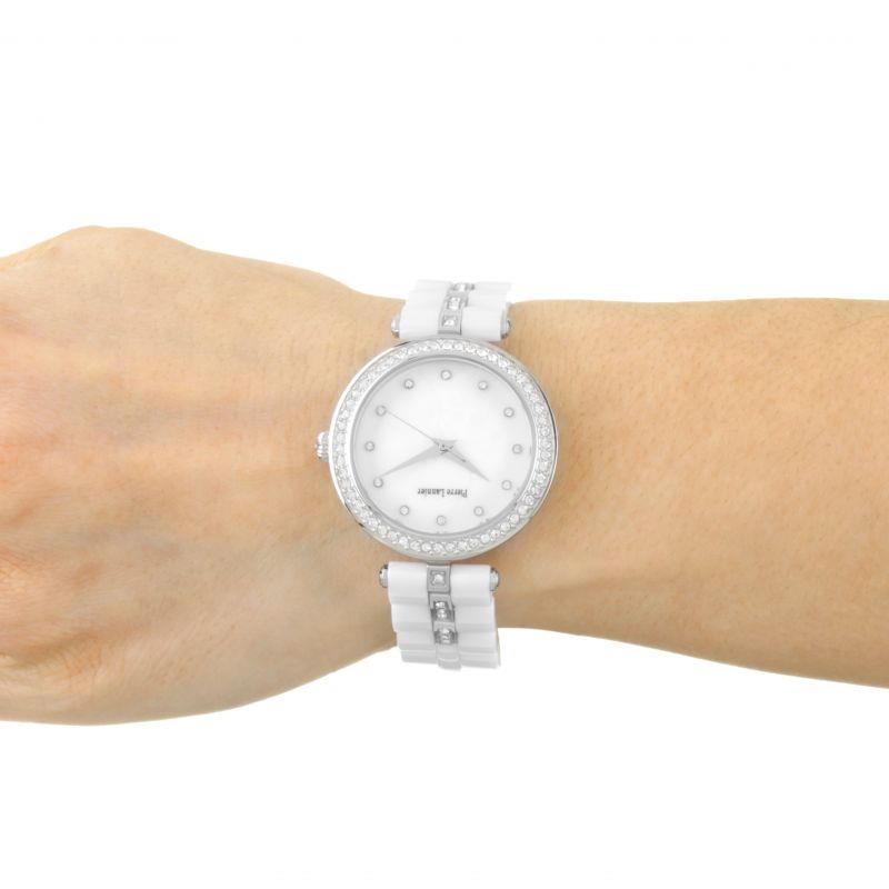 ساعت مچی زنانه پیرلنیرpierre lannier با طراحی کلاسیک بند سرامیکی سفید و قاب دور نگین استیل و صفحه نگین دار نقره ای و موتور ژاپنی با انرژی باتری و مقاوم در برابر آب تا عمق 30 متر به همراه گارانتی بین المللی