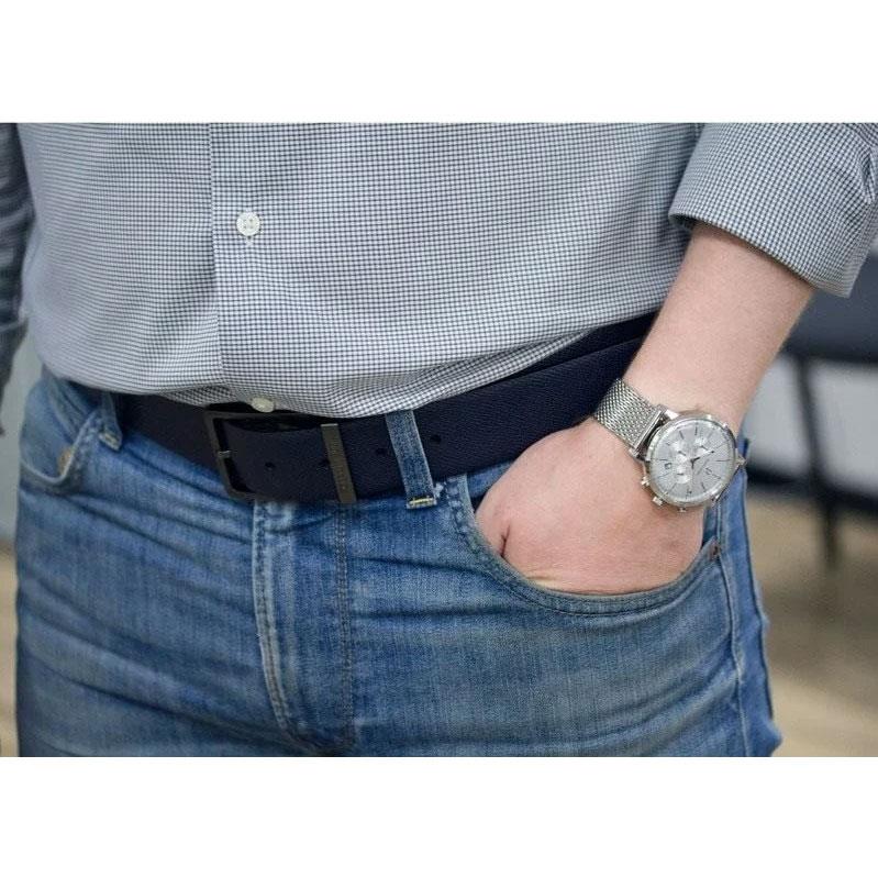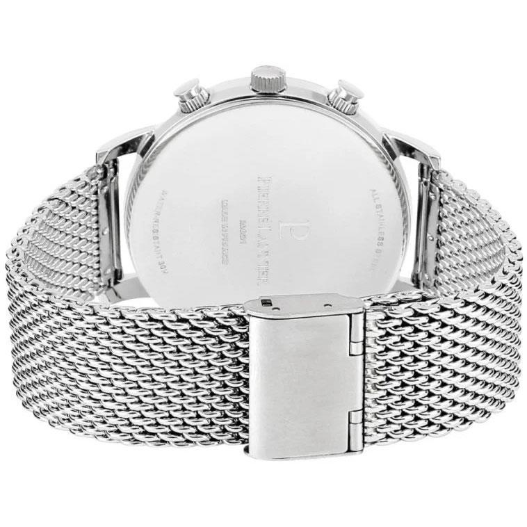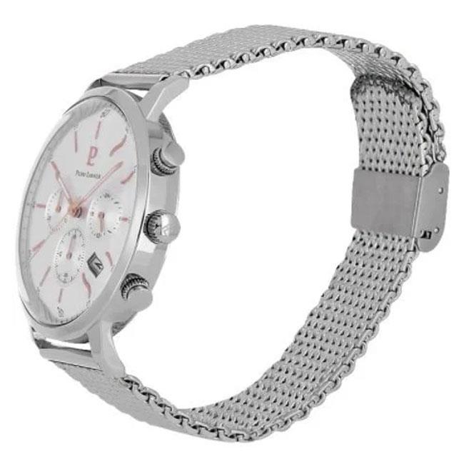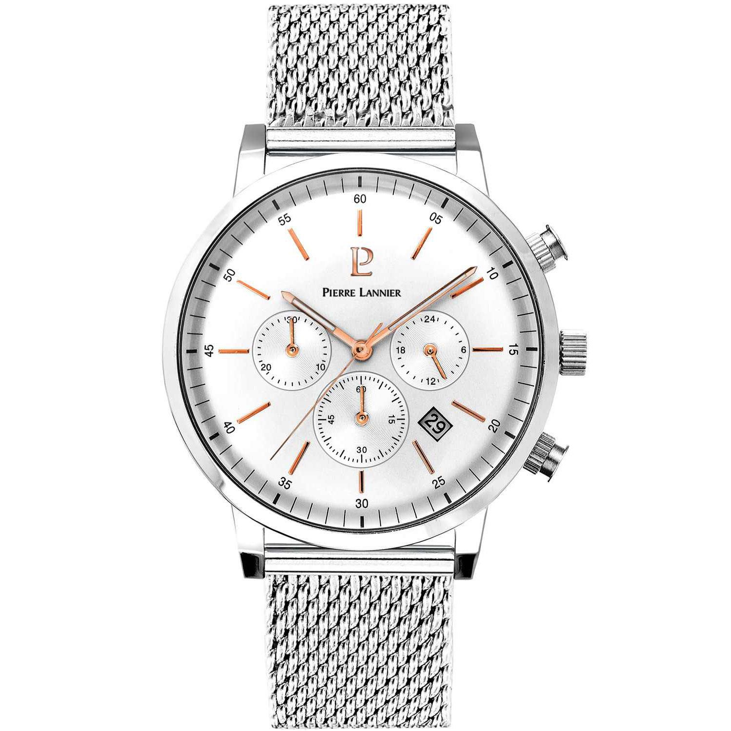 ساعت مچی مردانه پیرلنیر pierre lannier با طراحی روزانه بند حصیر بافت استیل و قاب گرد استیل و صفحه گرد نقره ای با قابلیت داشتن تقویم/ کرنوگراف / روز و شب / شب نما و موتور ژاپنی با انرژی باتری و مقاوم در برابر آب تا عمق 50 متر به همراه گارانتی بین المللی