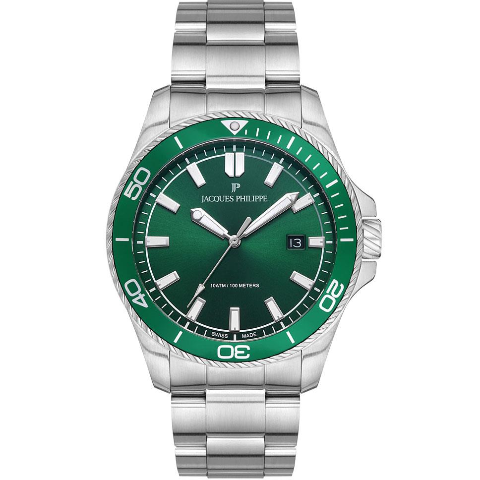 ساعت مچی مردانه ژاک فیلیپ jacques philippe با طراحی اسپرت بند استیل و قاب استیل سبز و صفحه گرد سبز با شیشه ضد خراش و قابلیت داشتن تقویم شب نما زه چرخان و موتور سوییسی با انرژی باتری و مقاوم در برابر آب تا عمق 100 متر به همراه گارانتی بین المللی