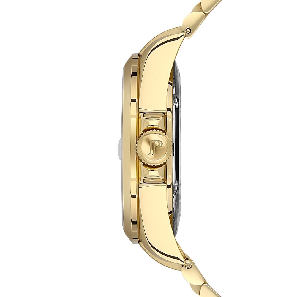 ساعت مچی مردانه ژاک فیلیپ jacques philippe با طراحی اسپرت بند استیل طلایی و قاب گرد استیل طلایی و صفحه گرد مشکی با شیشه ضد خراش و قابلیت داشتن تقویم شب نما و موتور سوییسی با انرژی باتری و مقاوم در برابر آب تا عمق 100 متر به همراه گارانتی بین المللی
