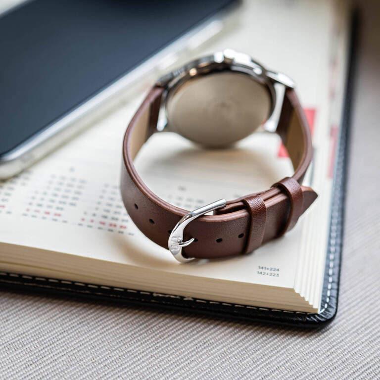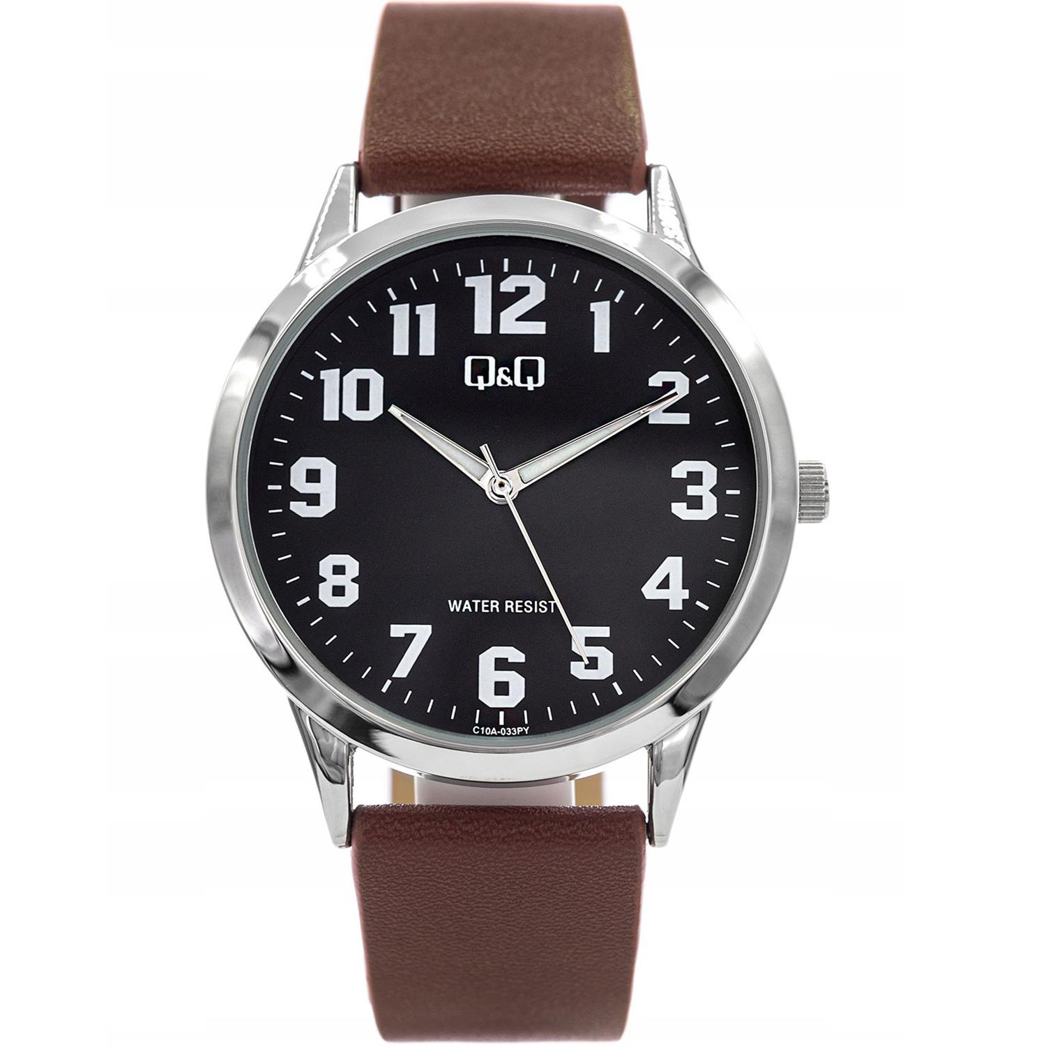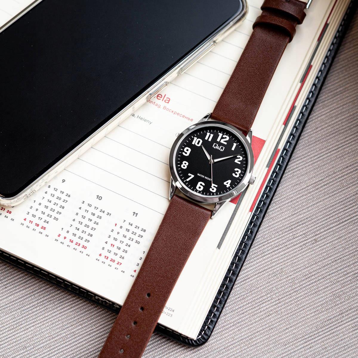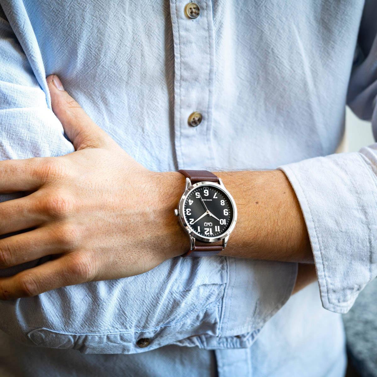 ساعت مچی مردانه کیو اند کیو QQ با طراحی روزانه بند چرمی قهوه ای و قاب گرد فلزی و صفحه گرد مشکی و موتور ژاپنی با انرژی باطری و مقاوم در برابر آب تا عمق 30 متر به همراه یک سال گارانتی شرکتی