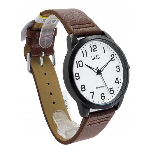 ساعت مچی مردانه کیو اند کیو QQ با طراحی روزانه بند چرمی قهوه ای و قاب گرد فلزی مشکی و صفحه گرد سفید و موتور ژاپنی با انرژی باطری و مقاوم در برابر آب تا عمق 30 متر به همراه یک سال گارانتی شرکت