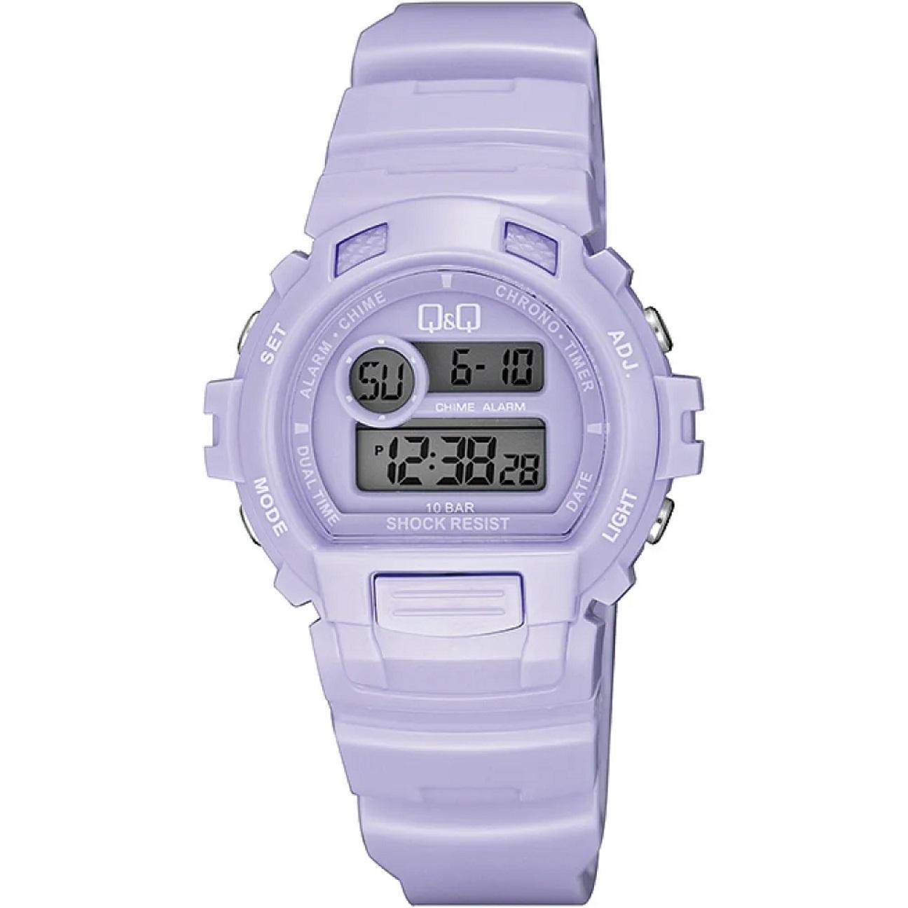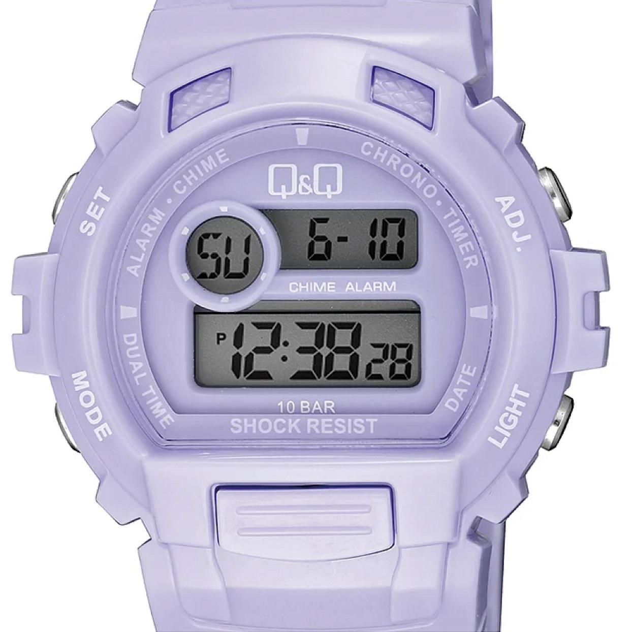 ساعت مچی دخترانه کیو اند کیو QQ با طراحی روزانه بند سیلیکونی بنفش و قاب گرد بنفش و صفحه طوسی با نمایشگر دیجیتال و قابلیت داشتن کرنوگراف , روزهای هفته, روز و شب ,نور پشت صفحه, تقویم, زنگ هشدار و موتور ژاپنی با انرژی باطری و مقاوم در برابر آب تا عمق 100 متر به همراه یک سال گارانتی شرکت