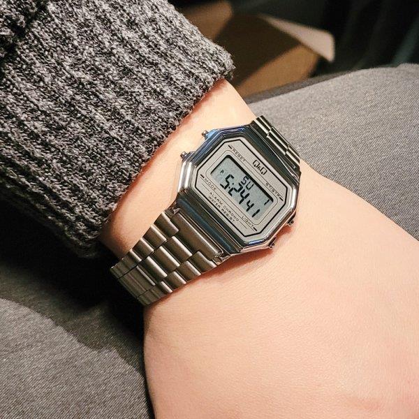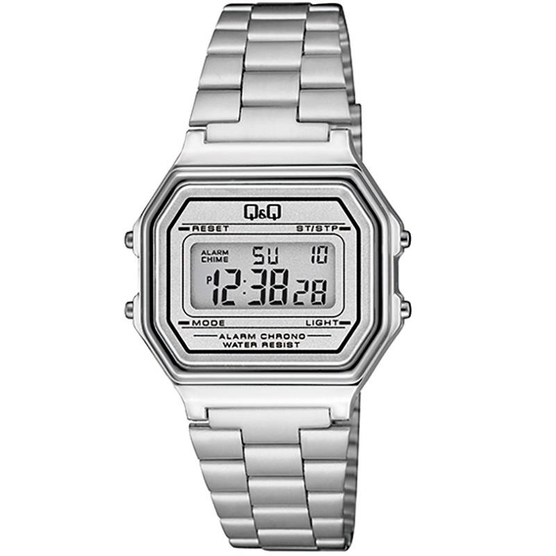 ساعت مچی مردانه /زنانه کیو اند کیو QQ با طراحی روزانه بند فلزی و قاب مربع و صفحه طوسی با نمایشگر دیجیتال و قابلیت داشتن کرنوگراف , روزهای هفته, روز و شب ,نور پشت صفحه و موتور ژاپنی با انرژی باطری و مقاوم در برابر آب تا عمق 30 متر به همراه یک سال گارانتی شرکت