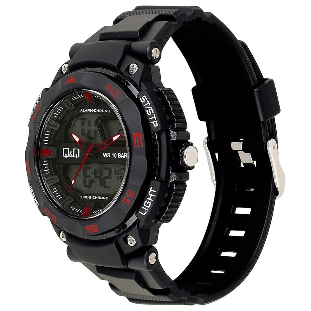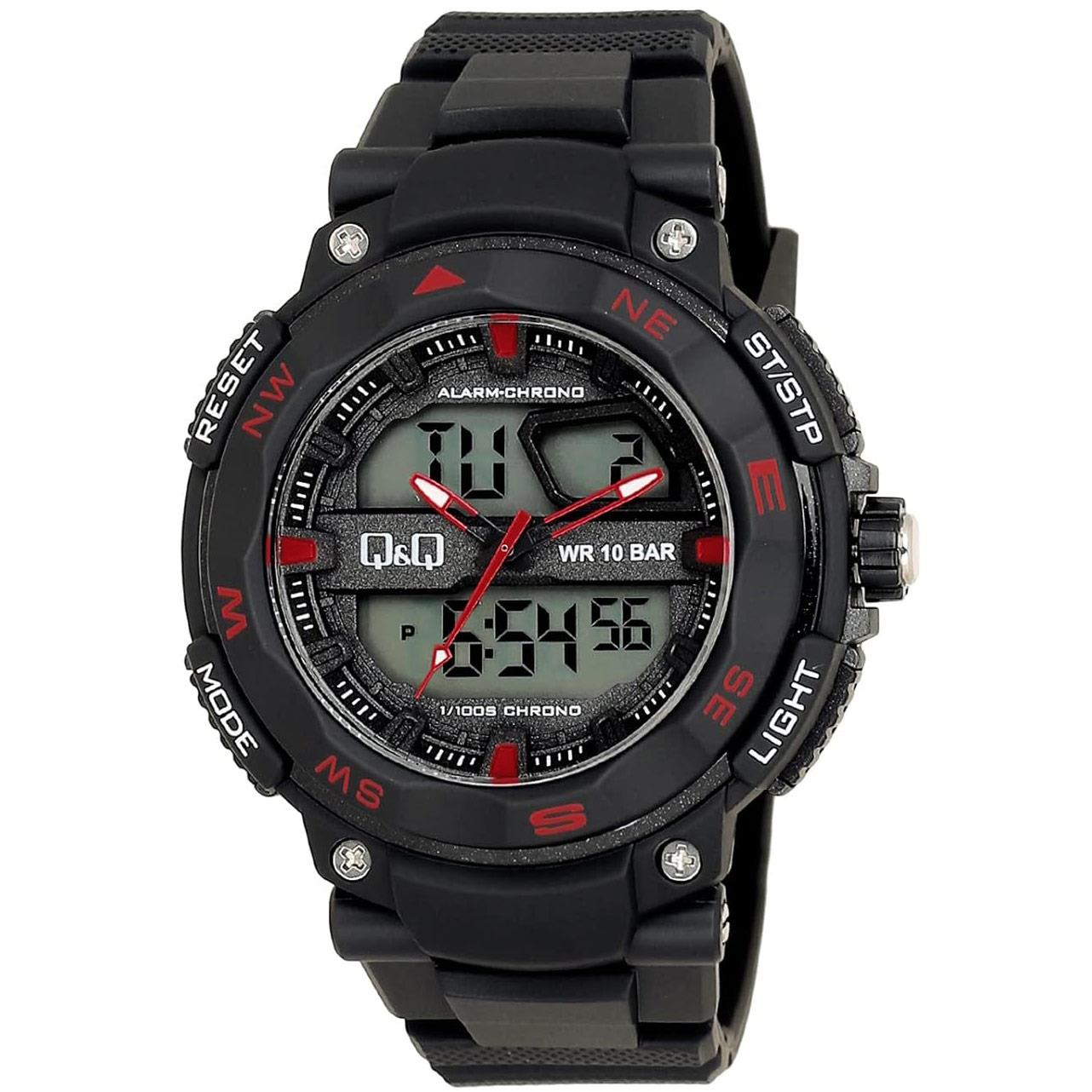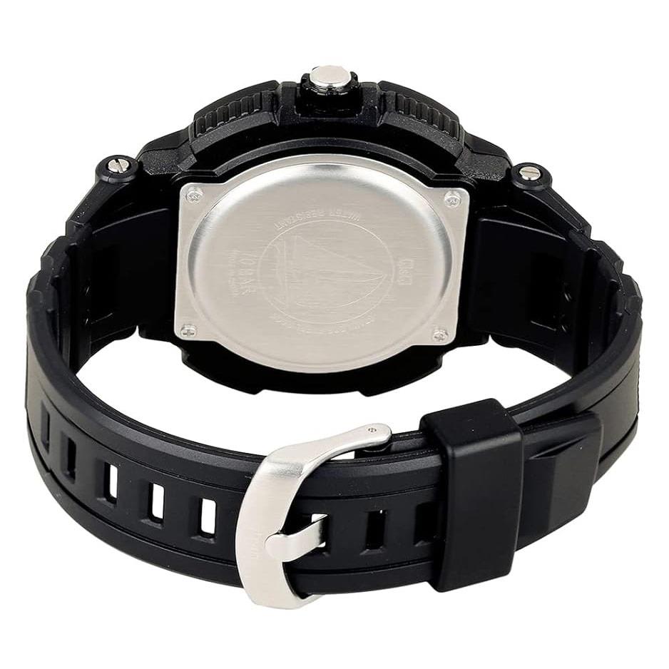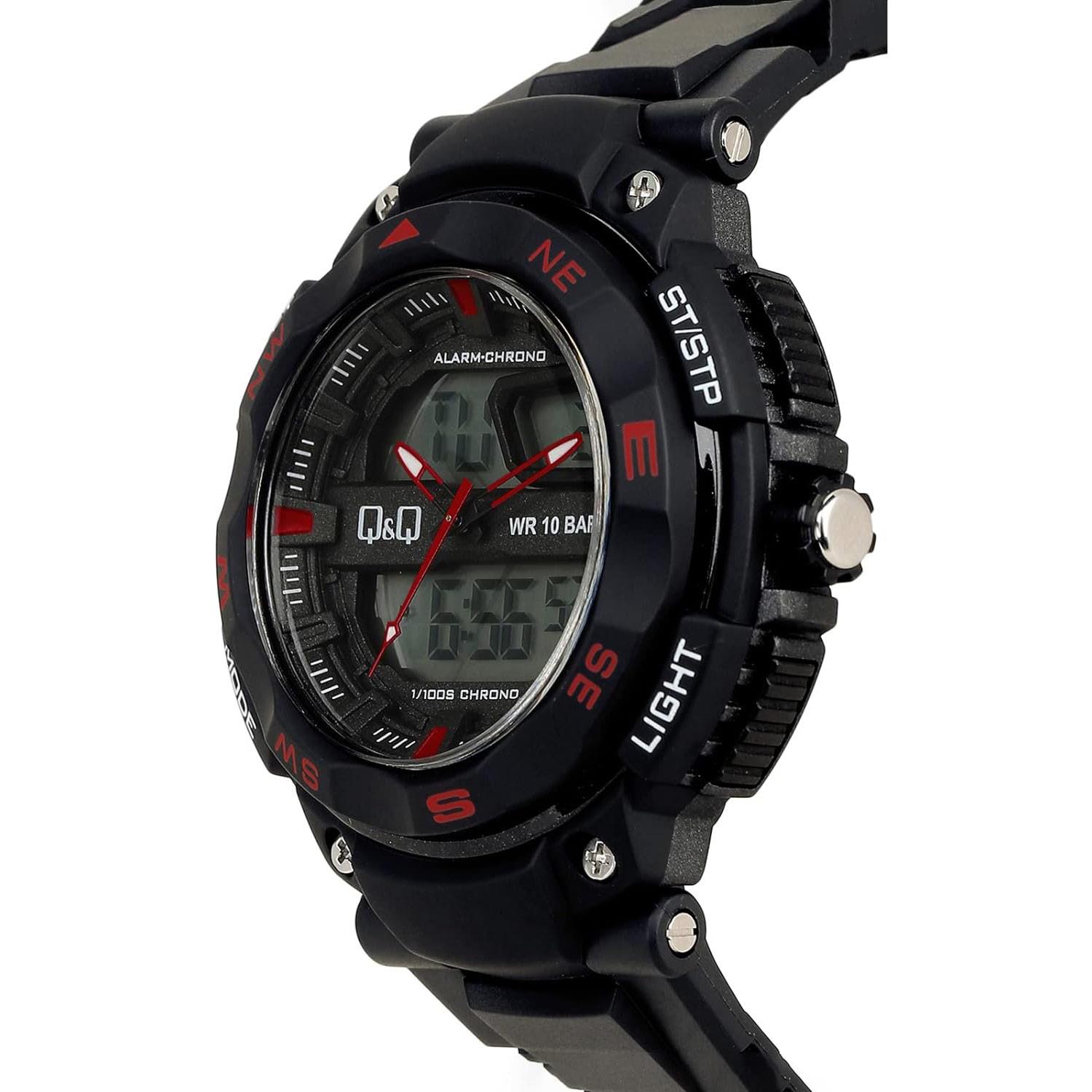 ساعت مچی مردانه کیو اند کیو QQ با طراحی روزانه بند مشکی و قاب گرد دو رنگ و صفحه طوسی با نمایشگر دیجیتال /عقربه ای و قابلیت داشتن کرنوگراف , روزهای هفته, روز و شب  ,ساعت کشورها ,تایمرشمارش معکوس ,نور پشت صفحه ,زه چرخان و موتور ژاپنی با انرژی باطری و مقاوم در برابر آب تا عمق 100 متر به همراه یک سال گارانتی شرکت