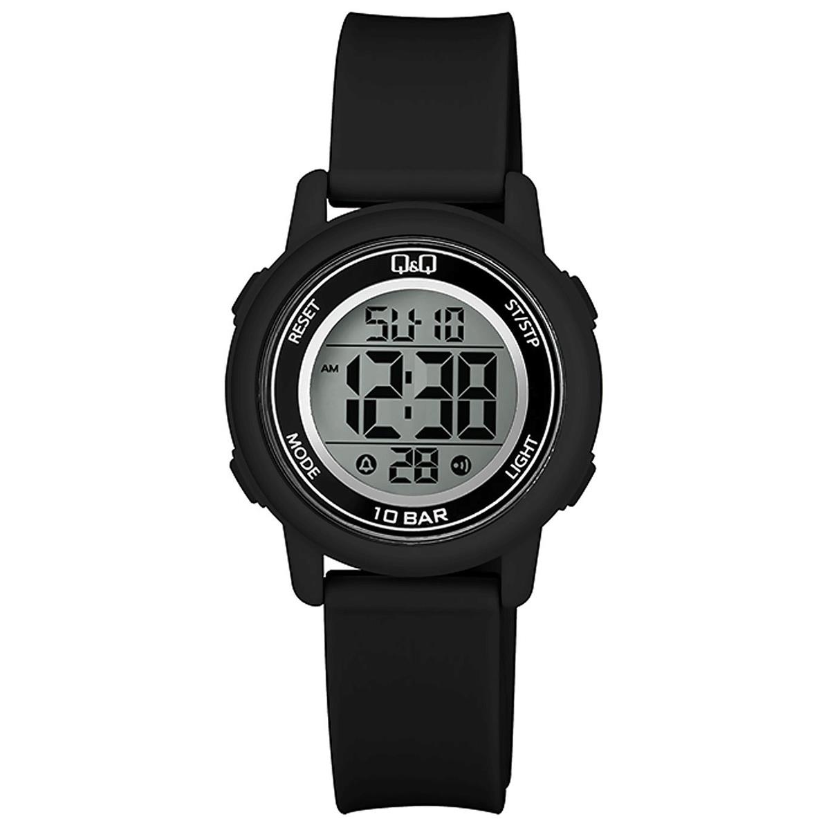 ساعت مچی پسرانه/ دخترانه کیو اند کیو QQ با طراحی روزانه بند سیلیکونی مشکی و قاب گرد مشکی و صفحه طوسی مسی با نمایشگر دیجیتال و قابلیت داشتن کرنوگراف , روزهای هفته, روز و شب , نور پشت صفحه, زنگ هشدار, تقویم و موتور ژاپنی با انرژی باطری و مقاوم در برابر آب تا عمق 100 متر به همراه یک سال گارانتی شرکت
