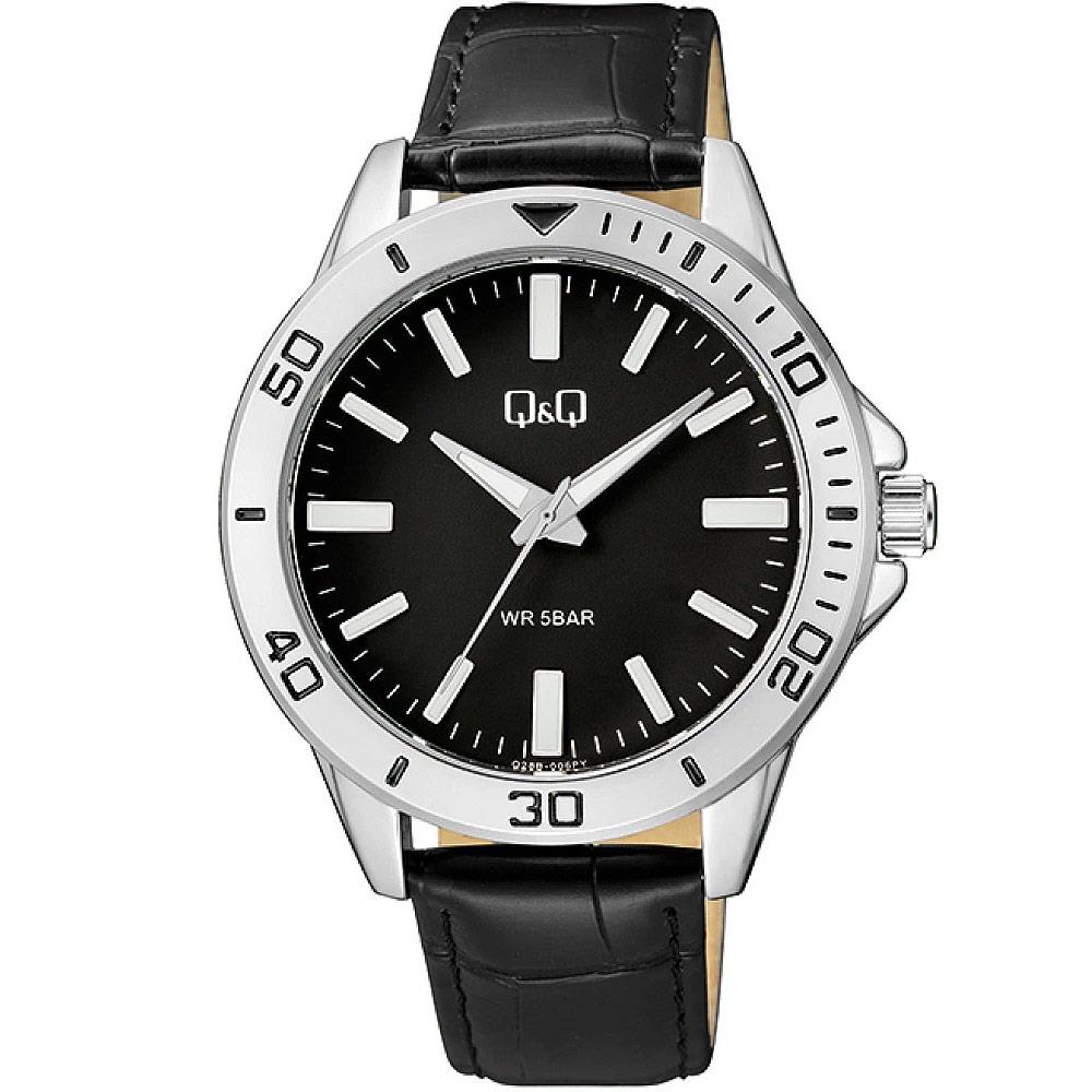 ساعت مچی مردانه کیو اند کیو QQ با طراحی روزانه بند چرمی و قاب گرد و صفحه مشکی با قابلیت داشتن شب نما و موتور ژاپنی با انرژی باطری مقاوم در برابر آب تا عمق 50 متر به همراه یک سال گارانتی شرکت
